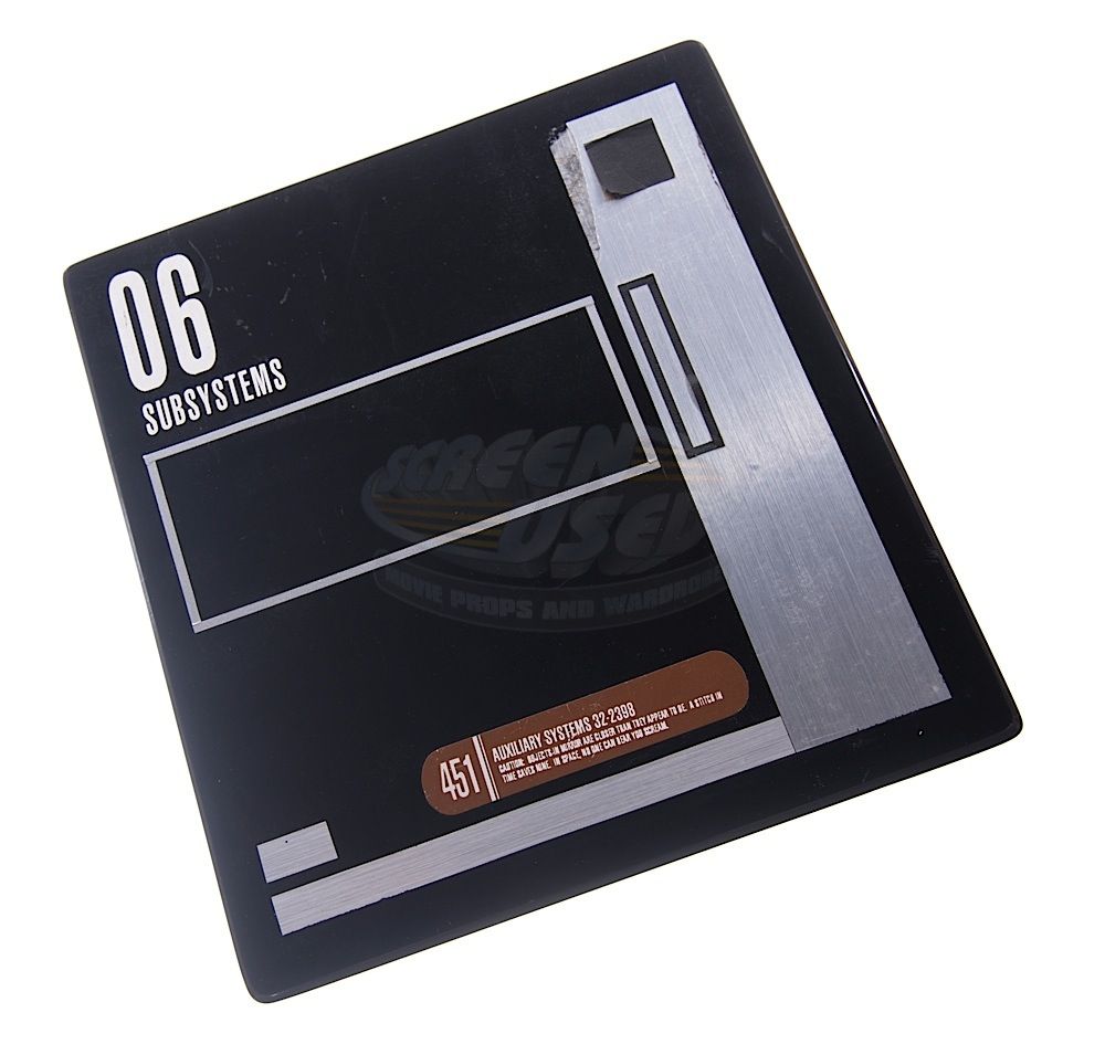 (Paramount-TV, 1987-94) This prop wall panel was custom-made by the production for use as set dressing. The panel features the unique "Starfleet" detailing with hand applied stickers to a section of black acrylic. The fine print on the "Auxiliary Systems" sticker reads "Caution: Objects in mirror are closer than they appear, A stitch in time saves nine and In space no one can hear you scream". As a running joke many of the props and set dressing pieces featured phrases and jokes printed or applied to them to amuse the cast and crew, but were too small to be read on screen. Measures 11.25" x 10" with minor wear from use.