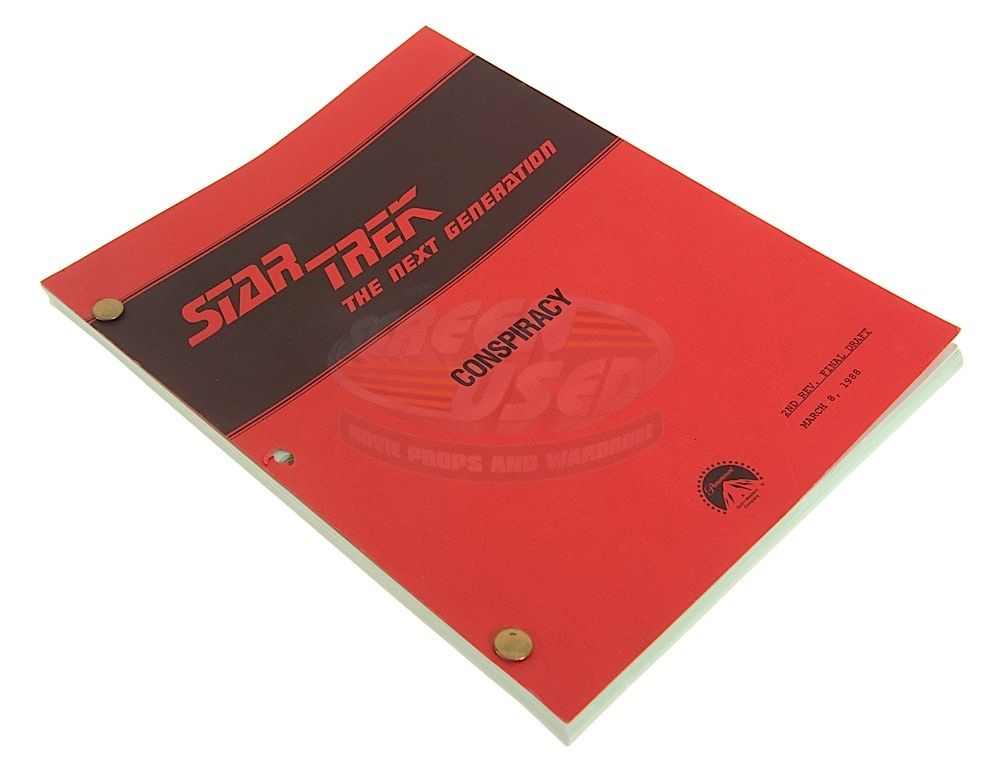 (Paramount television, 1987-1994) This 55 page production script is titled "Conspiracy" and is the final draft dated March 8, 1988 and features all green pages. The script is held together with two button style clips and has only minor wear from use.