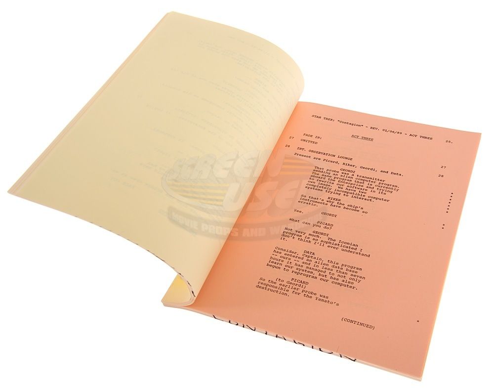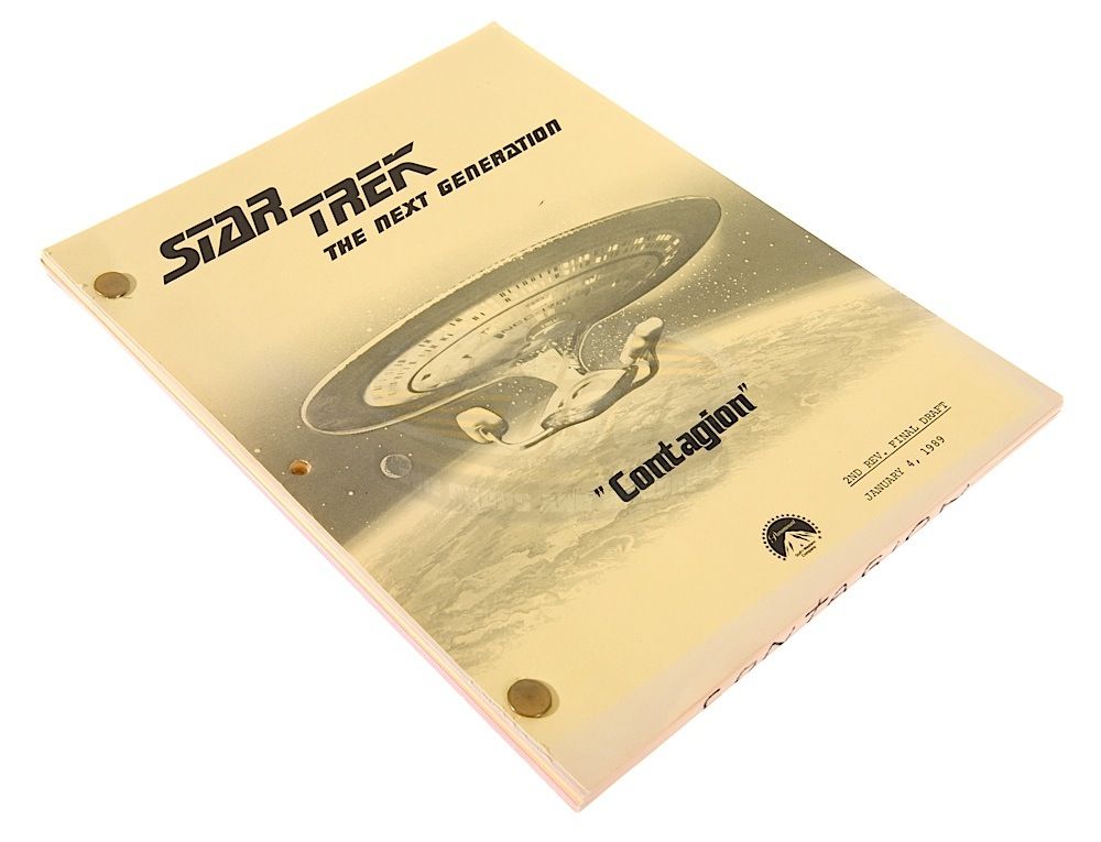 (Paramount television, 1987-1994) This production script is titled "Contagion" and is the final draft dated January 4, 1989. It has 54 multi-colored pages and is held together with two button style clips. This script was Susan Sackett's personal production copy. Susan worked with Gene Roddenberry for more than 17 years in various capacities, including Roddenberry's personal executive assistant. She later went on to write an episode of TNG as well as several books on Star Trek. In addition to our ScreenUsed COA, this script comes with a signed COA from Susan Sackett on her Star Trek: The Next Generation stationary.
