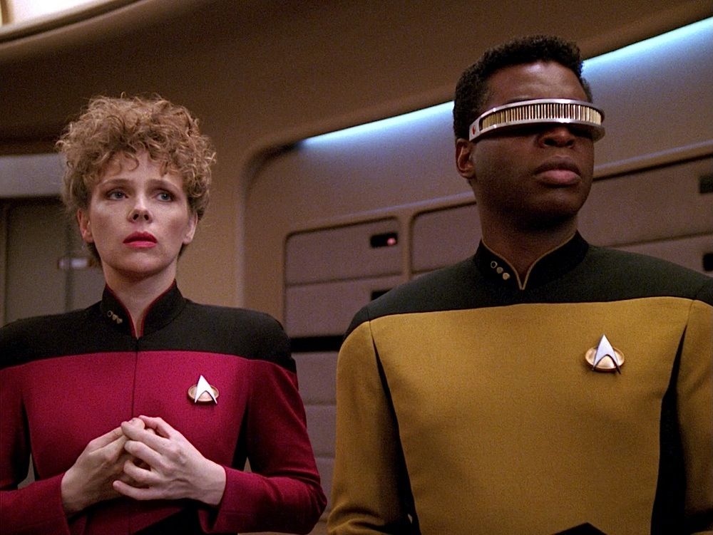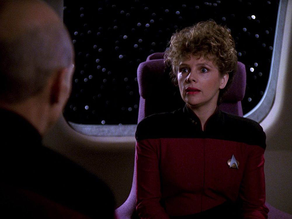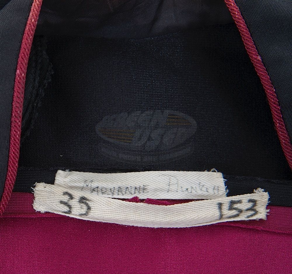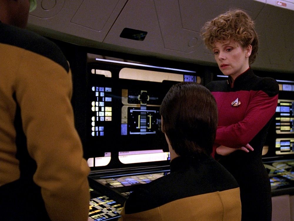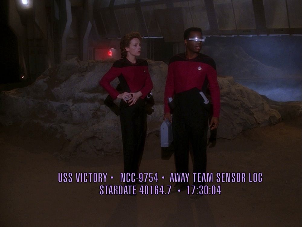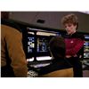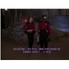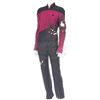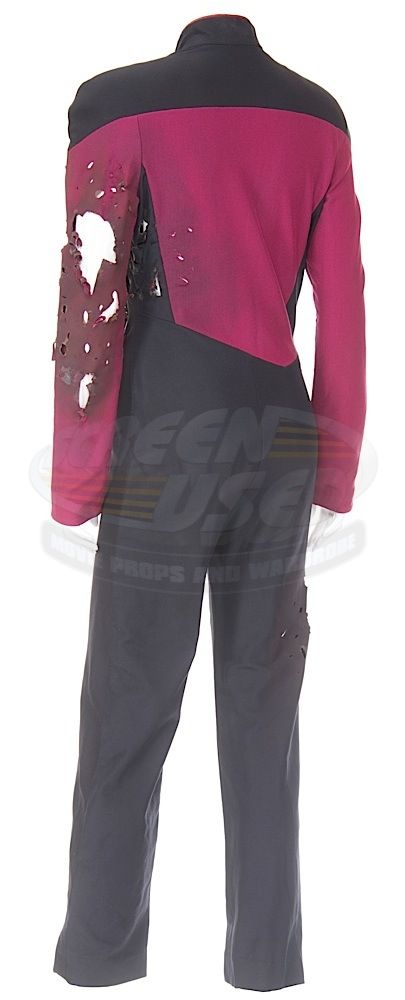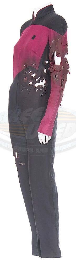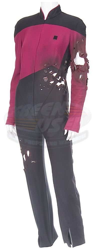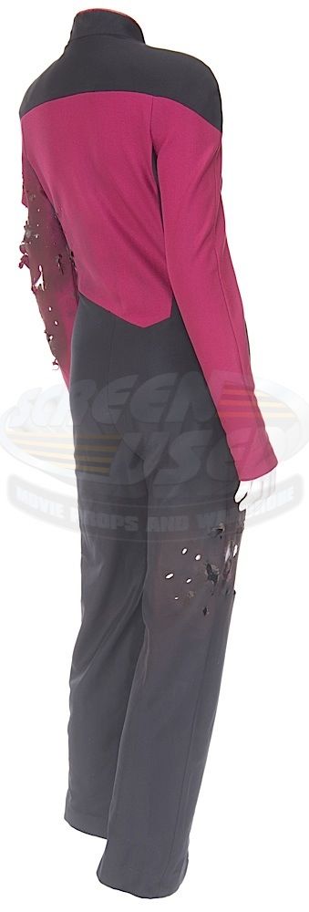 (Paramount-TV, 1987-94) This Starfleet uniform was custom-made by the production for use by Maryann Plunkett as "Lt. Commander Leitjen" in the season four episode titled "Identity Crisis". This costume is a uniform jumpsuit featuring the black shoulders with a command red chest, back and black waist, shoulders and legs that end in stirrups. This style also exhibits the Mandarin collar common to cast members during and after the third season which features red piping along the top of the collar. This particular uniform has a zip down the front and features a Velcro patch on the left breast. The costume has been intentionally distressed in the form of a large hole all the way through the left arm and various small holes and burn marks along the arm and left side of the abdomen, for use in another episode. The uniform has two sewn in tags, one reads 'Maryanne Plunkett' and a second one reads '35, 153'. In addition to our ScreenUsed COA, this uniform comes with the original "It's A Wrap!" COA.