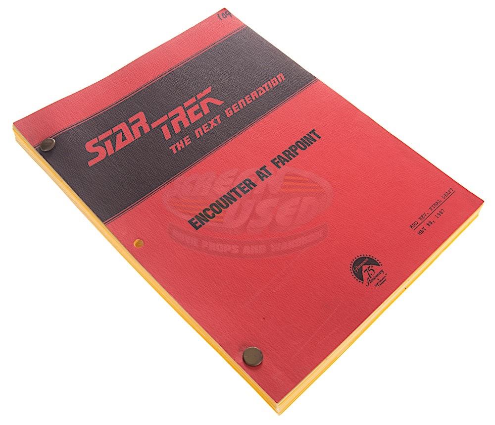 (Paramount television, 1987-1994) This production script is titled "Encounter At Farpoint", the first episode of the series and is the 3rd revised final draft dated May 22, 1987. It has 110 multi-colored pages and is held together with two button style clips. The script has only minor wear and remains in very good condition.