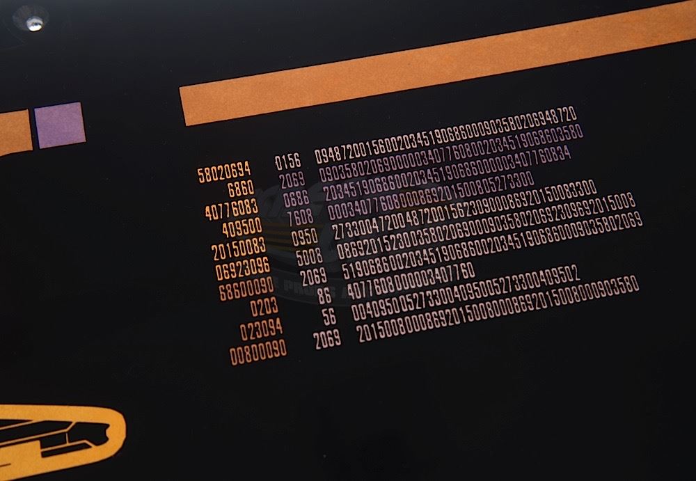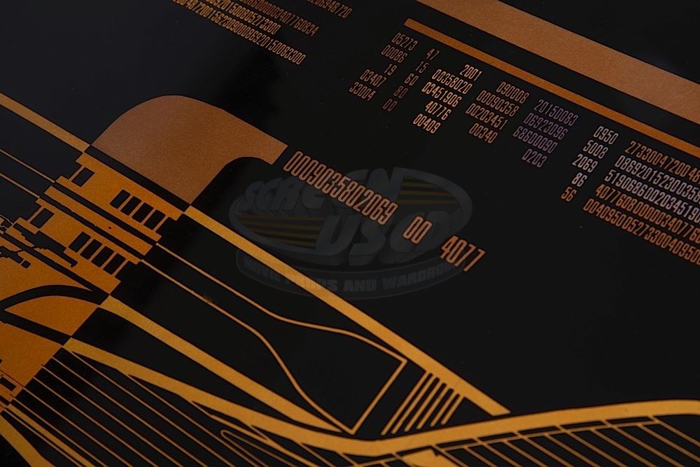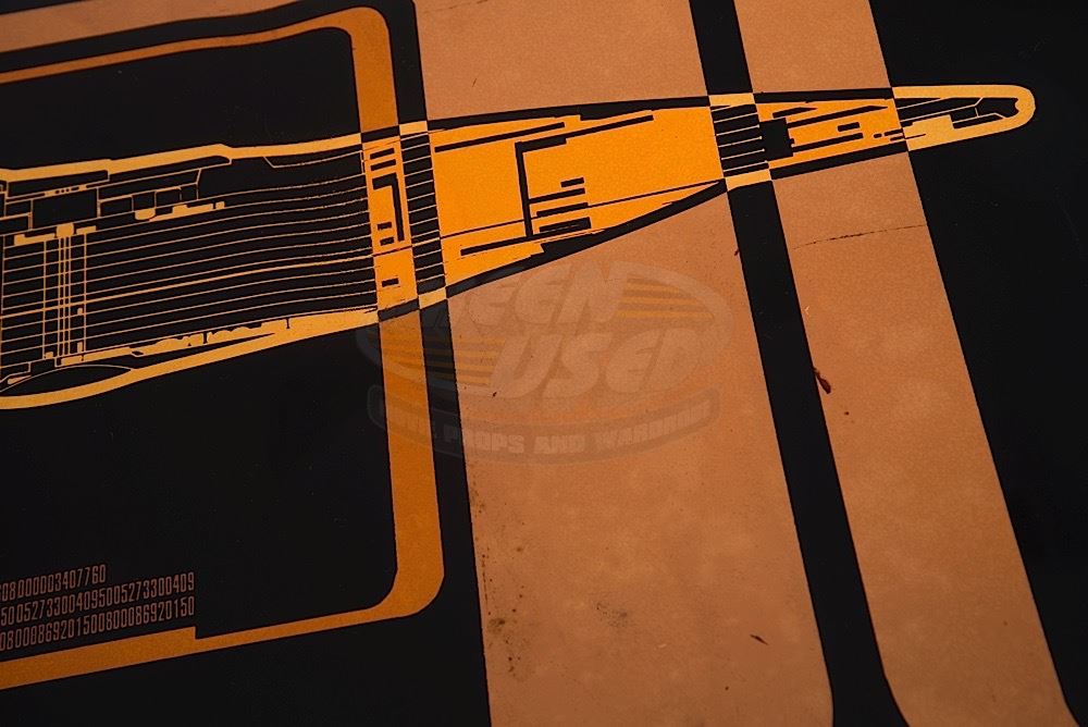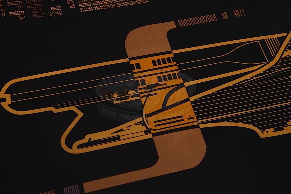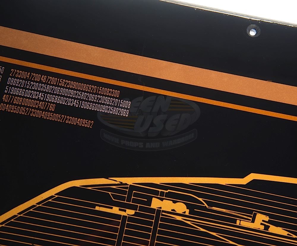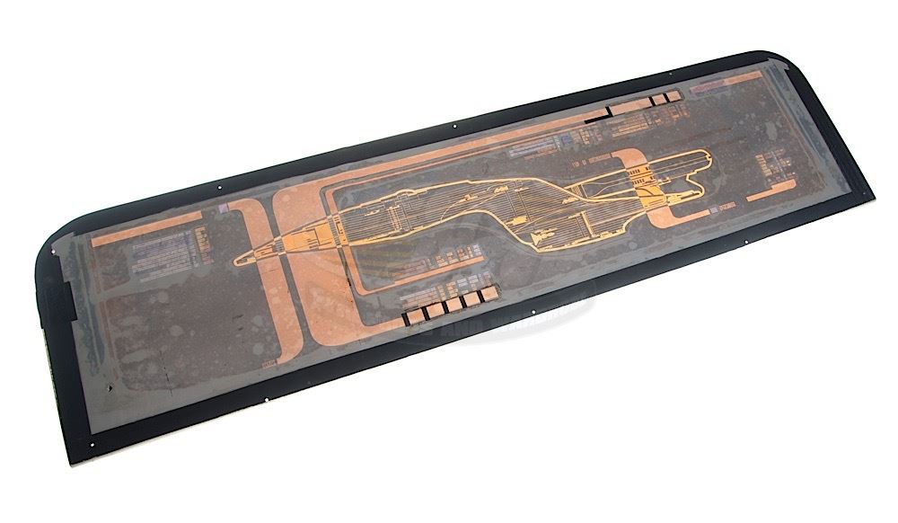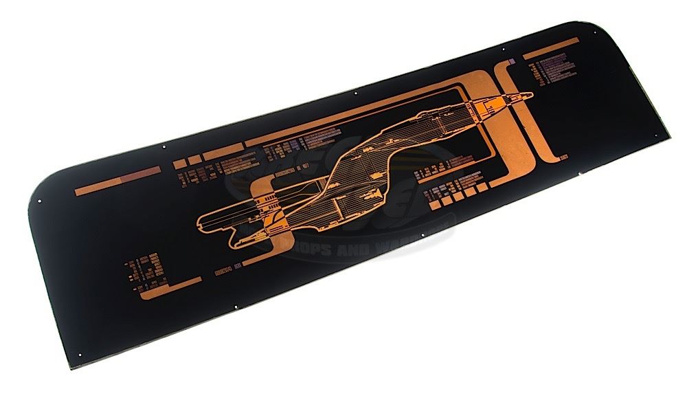 (Paramount-TV, 1987-94) This back lit panel was custom-made by the production for use as set dressing in Engineering. The plastic panel features the image of the Starship Enterprise and measures 13.5" tall x 51" wide. The panel has minor wear from use and a small section of the plastic is warped, but does not take away from the look of the graphics. There were several styles of these panels with various graphics used during filming, however this is a very iconic set piece as it features the Starship Enterprise.