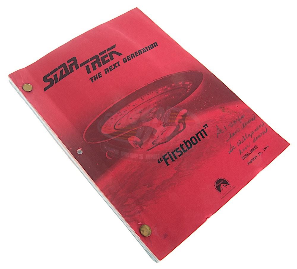 (Paramount television, 1987-1994) This production script was issued to the show's hair and makeup department. The script is titled "Firstborn" and is the final draft dated January 28, 1994. It has 59 pages and is held together with two button style clips. 35 Polaroids of various actors are attached to the first two pages for reference during filming. Wear from use is present.