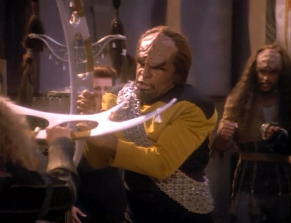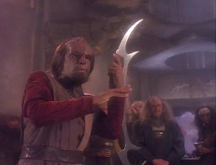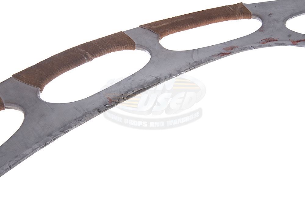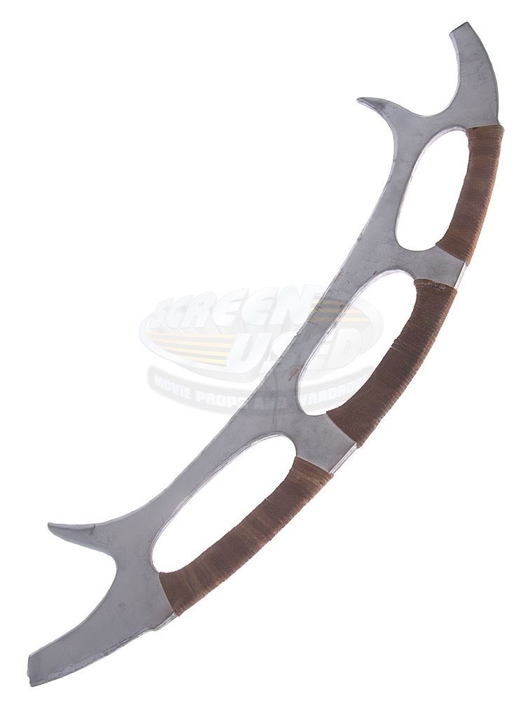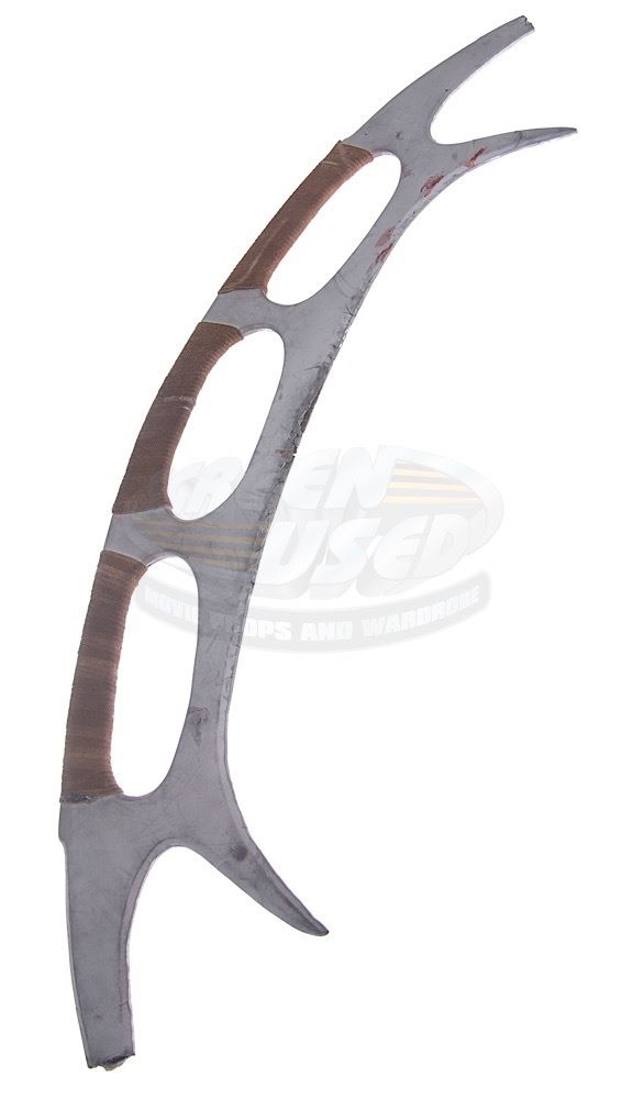 (Paramount Television, 1987-1994) This Bat'leth was custom-made by the production for use by various actors. This style prop is featured in various episodes of the series. Made of hard rubber over a metal frame and custom painted to give the appearance of being made of metal. The prop measures 38" in length and the handgrips are wrapped in leather. Two of the tips have broken off revealing the metal framework within the rubber, other wear consistent with use is present.