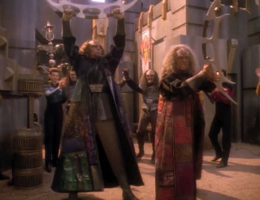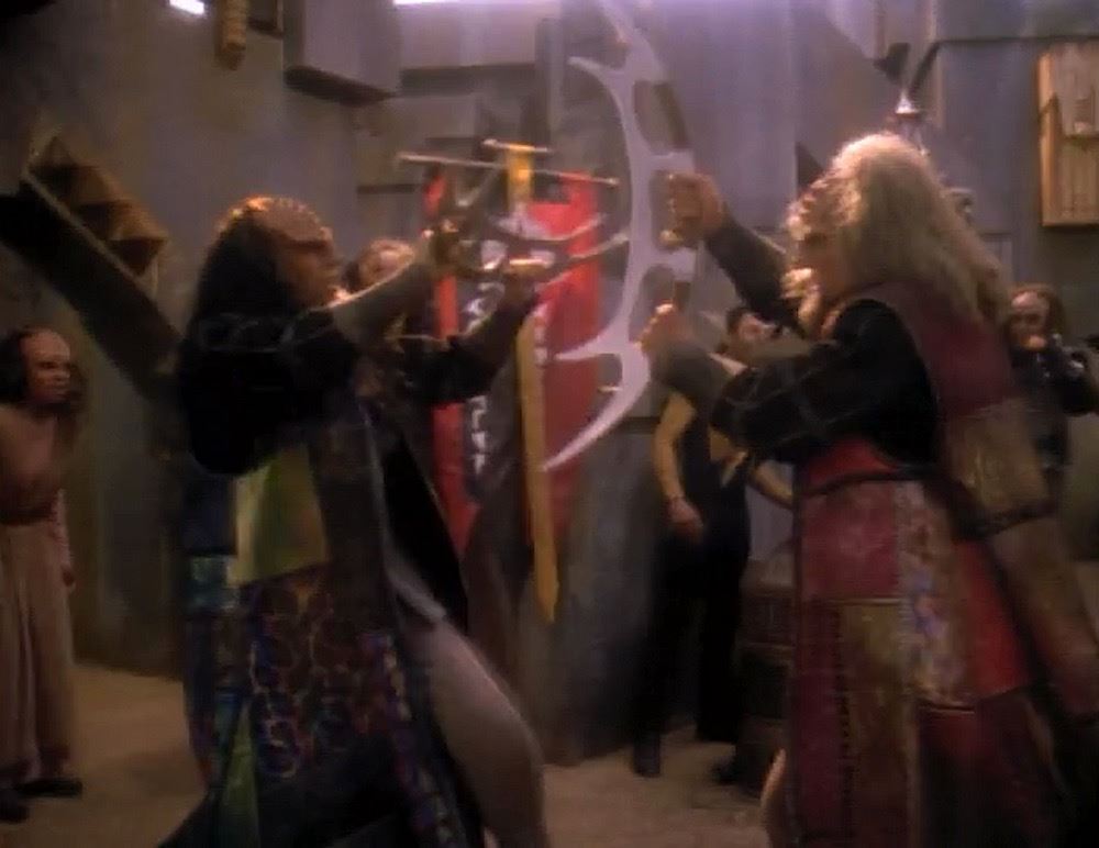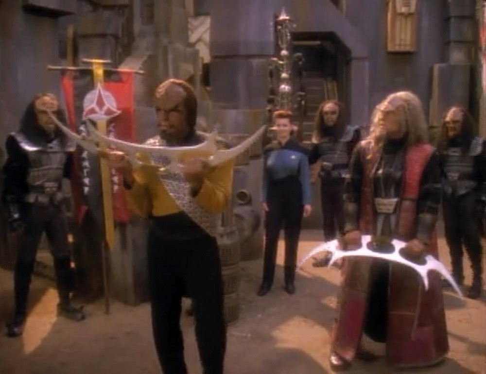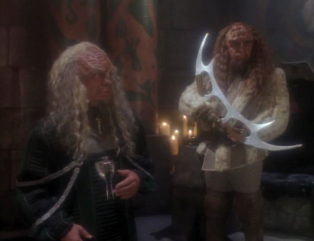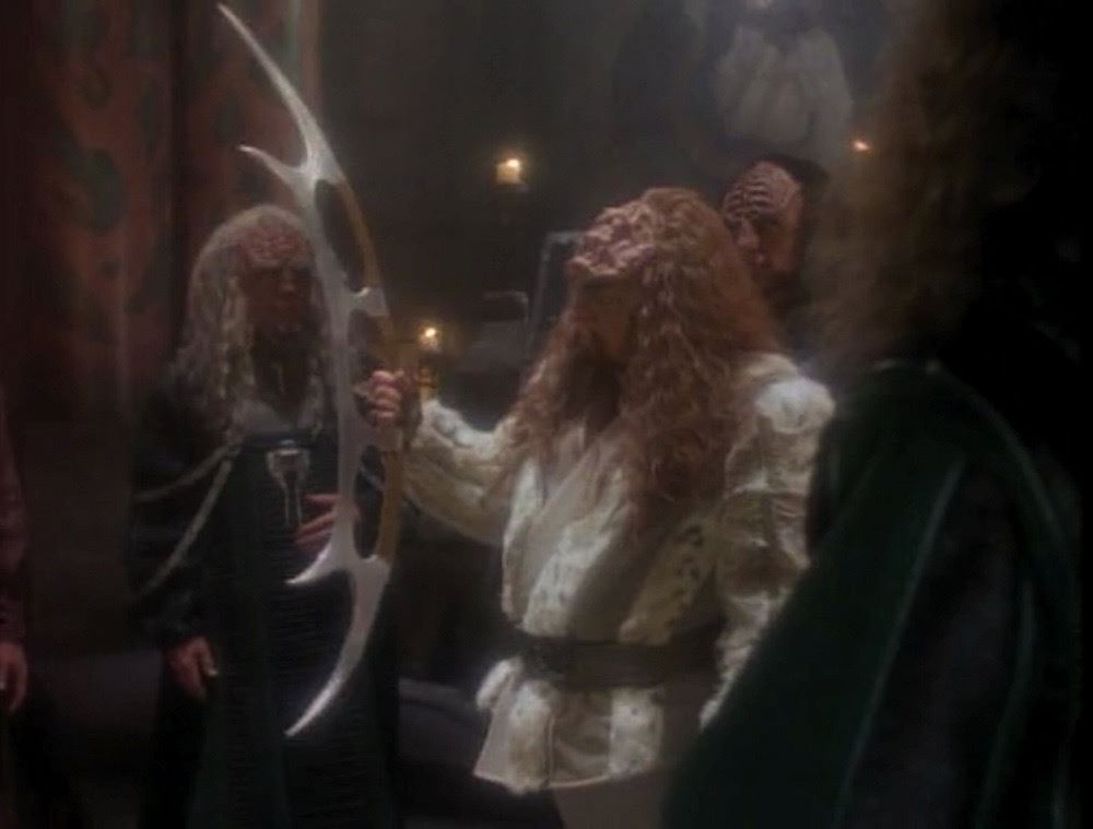 (Paramount Television, 1987-1994) This Bat'leth was custom-made by the production for use by various actors. This style prop is featured in various episodes of the series. Made of hard rubber over a metal frame and custom painted to give the appearance of being made of metal. The prop measures 38" in length and the handgrips are wrapped in leather. Two of the tips have broken off revealing the metal framework within the rubber, other wear consistent with use is present.