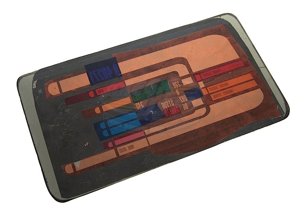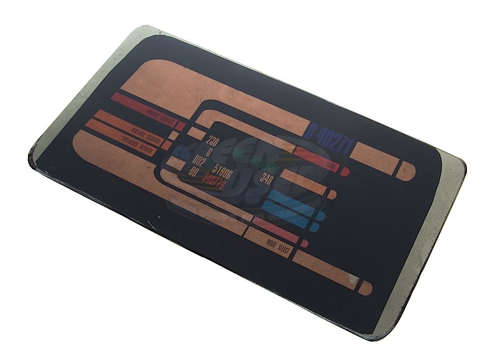(Paramount-TV, 1987-94) This prop "LCARS" control panel was custom-made by the production for use as set dressing. The back-lit panel features the unique "Starfleet" detailing with colored graphics applied to the back of smoked black acrylic. Measures 13" x 7" with minor wear from use.