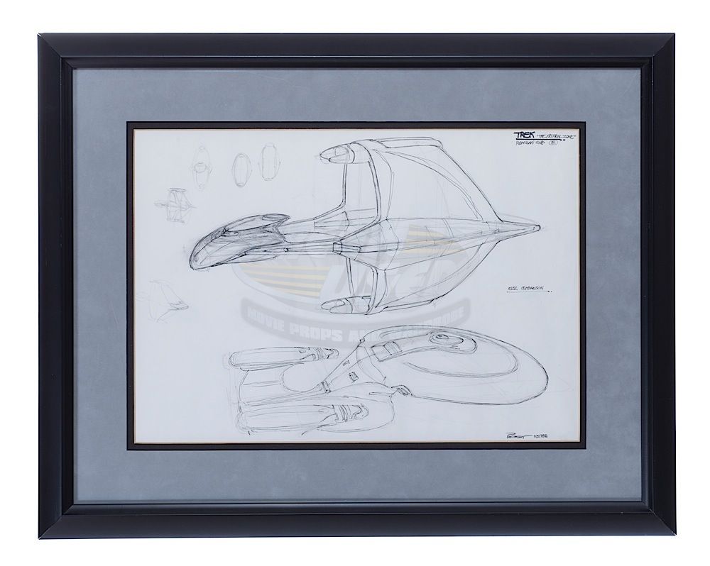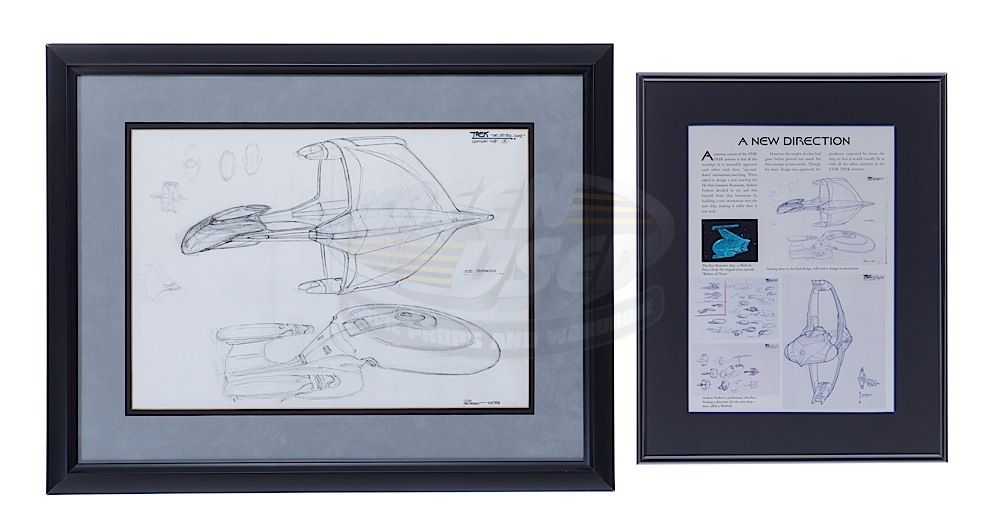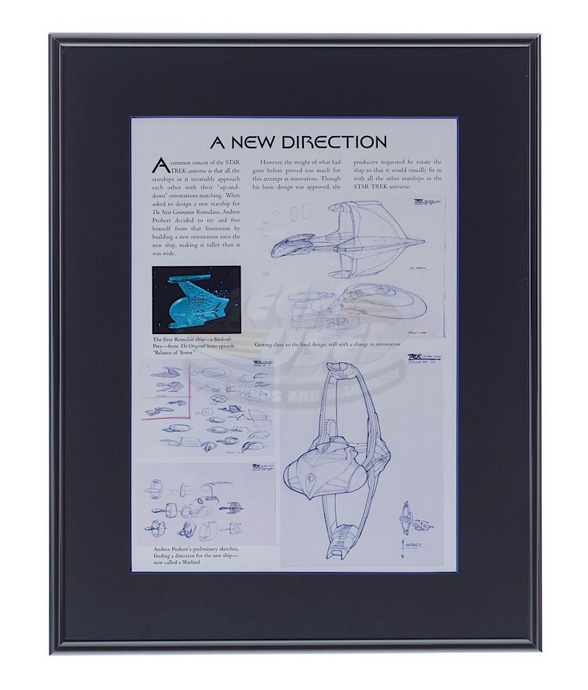(Paramount-TV, 1987-94) This is an original concept art of the Romulan Warbird and USS Enterprise by Andrew Probert. The artwork was done in pencil and pen with several thumbnail sketches of the Warbird in various angles and is signed by Andrew Probert at the bottom right side. This exact art is featured on page 82 of "The Art of Star Trek" by Judith and Garfield Reeves-Stevens, as well as in the recent EagleMoss Star Trek Ships Collection Document detailing the creation of the Roulman Warbird. Probert himself preferred this orientation of the Warbird over the screen used one and later even published it in a "Ships of the Line" calendar. The other interesting aspect is that Probert (The principal designer of the NCC-1701-D) has hand drawn his Enterprise alongside the Warbird for size comparison. The art has been matted and framed, art measures 16.5" x 11.5" and the frame measures 23" x 18.25". Included with the art is page 82 of "The Art of Star Trek" that is also matted and framed, measuring 15.75" x 12.5".