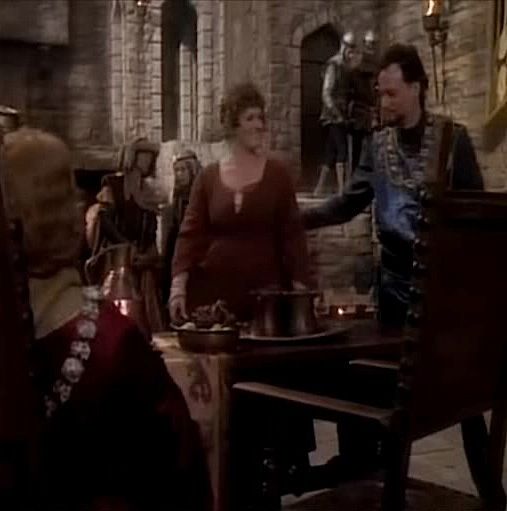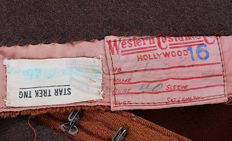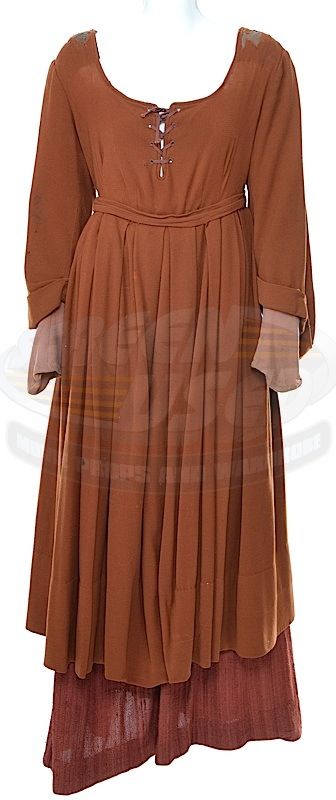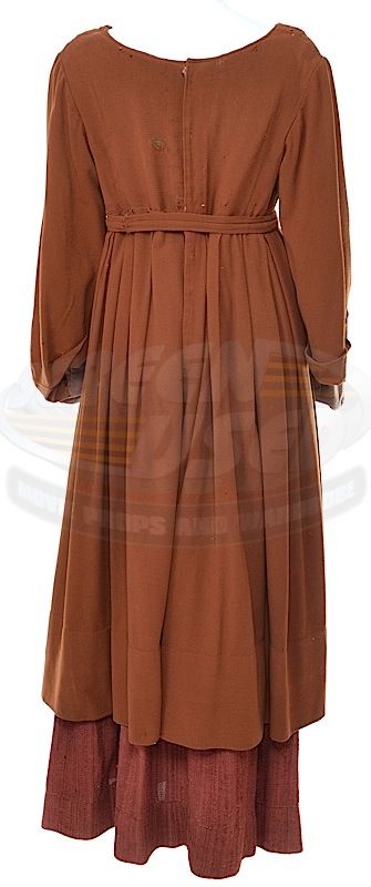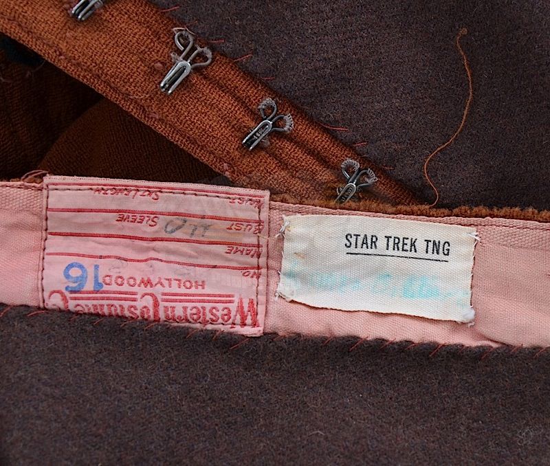 (Paramount-TV, 1993-99) This period dress was acquired by the production for use in the season four episode titled "Qpid". The dress features a matching attached belt and studio distressing. A Star Trek: The Next Generation tag is attached inside and a pre-existing Western Costume tag is also attached inside.