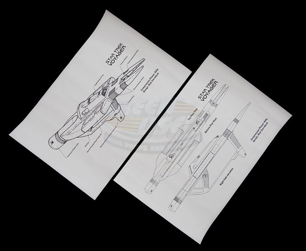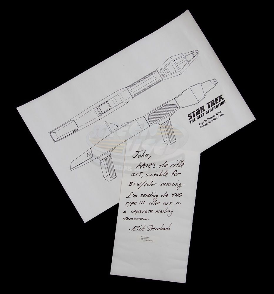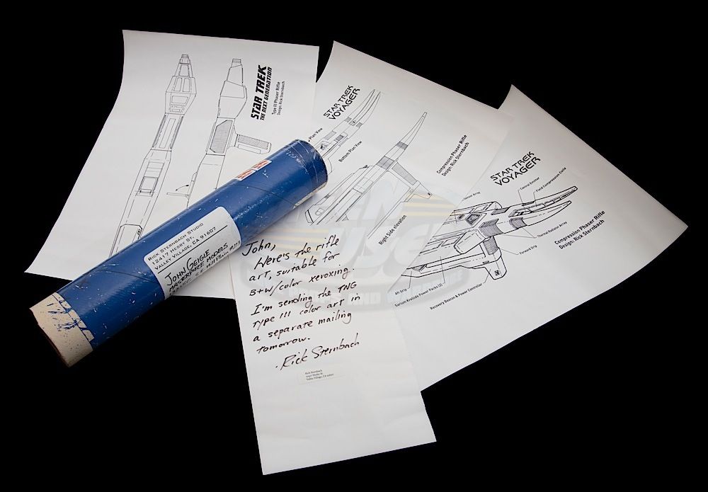 (CBS, 1987-1994) This set of three production used phaser rifle design prints were created by the show's senior illustrator, Rick Sternbach. The prints feature the "Type III Phaser Rifle" from TNG and the "Compression Phaser Rifle" from Voyager. Each print measures 11" x 17". These prints were sent to John Geigle of Masterpiece Models by Rick Sternbach and come with the mailing tube and personal letter to John from Rick.