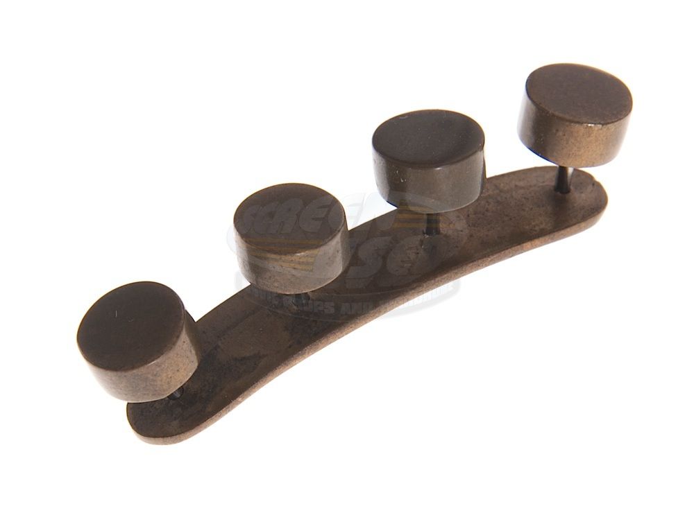 (CBS, 1987-1994) This set of Starfleet collar rank pips were custom-made by the production for use by various actors during the run of the show. The pips consist of four small circular brass pins, all joined on a common back piece, denoting the rank of Captain, the back piece was used to maintain proper spacing of the pips when worn on the collar.