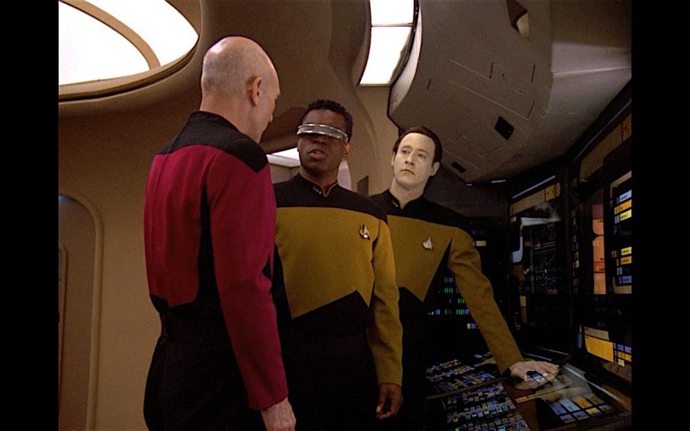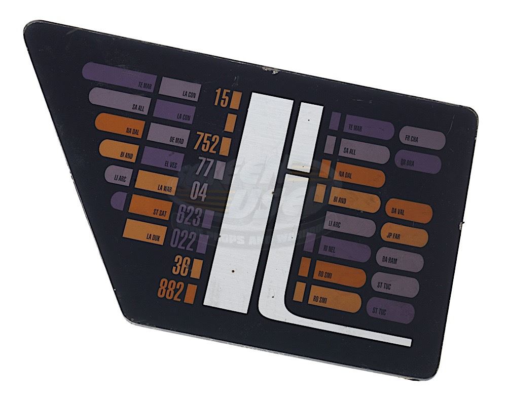 (Paramount-TV, 1987-94) This prop "LCARS" control panel was custom-made by the production for use as set dressing in various Star Trek productions. The back-lit panel features the unique "Starfleet" detailing with colored graphics applied to the back of smoked black acrylic. Measures 13" x 8" with minor wear from use.