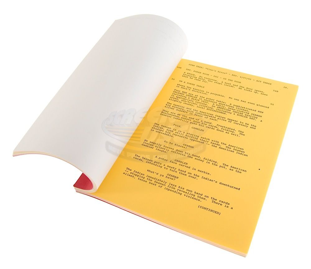 (Paramount television, 1987-1994) This production script is titled "Time's Arrow" and is the final draft dated April 6, 1992. It has 61 multi-colored pages and is held together with two button style clips.