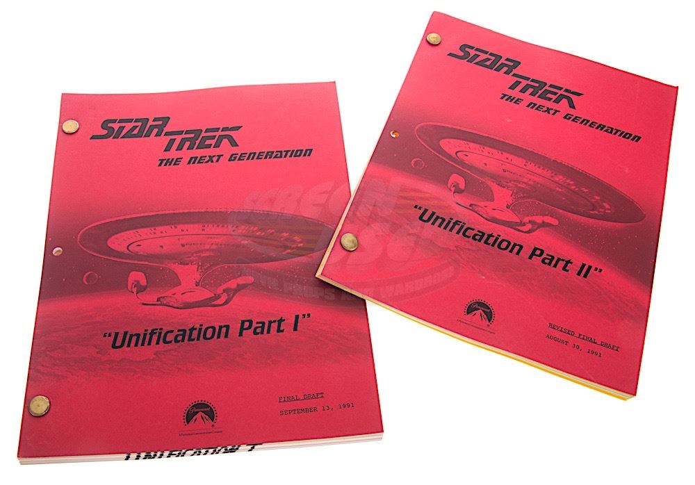 (Paramount television, 1987-1994) This set of production scripts are titled "Unification Part 1" and "Unification Part II". The first script is the final draft and is dated September 13, 1991. It has 54 multi-colored pages and is held together with two button style clips. The second script is the revised final draft and is dated August 30, 1991. It also has 54 multi-colored pages and is held together with two button style clips. The scripts have only minor wear and remain in very good condition.