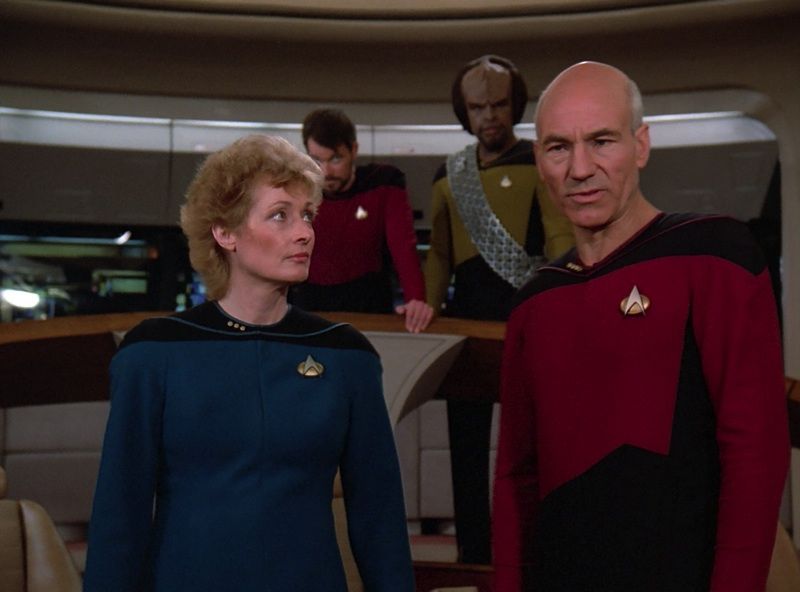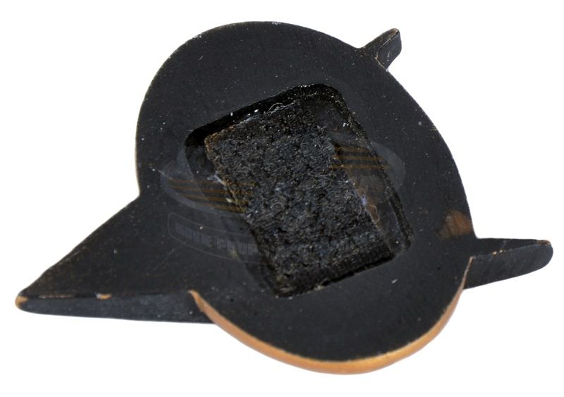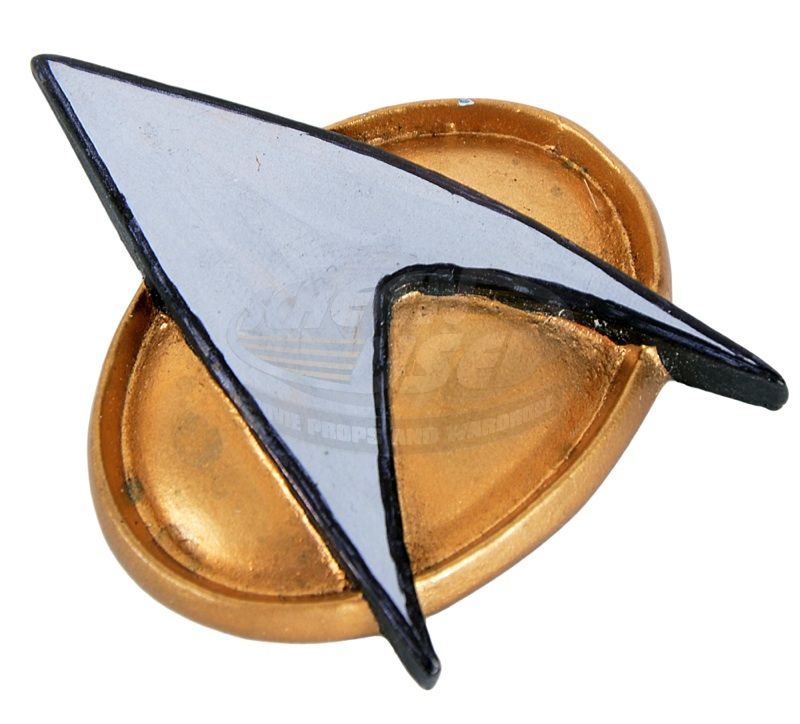 (Paramount-TV, 1987-94) This Starfleet comm badge was used on screen in several episodes by various characters. Velcro is applied to the back for attachment to the costume. This style badge was used by Captain Picard and Doctor Beverly Crusher among others.