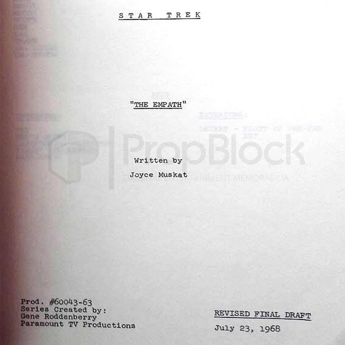 Original final draft script used in the production of the 1966 science fiction serrie Star Trek: The Original Series. The iconic series "Star Trek" follows the crew of the starship USS Enterprise as it completes its missions in space in the 23rd century. Captain James T. Kirk -- along with half- human/half-Vulcan science officer Spock, ship Dr. "Bones" McCoy, Ensign Pavel Chekov, communications officer Lt. Nyota Uhura, helmsman Lt. Hikaru Sulu and chief engineer Lt. Cmdr. Montgomery "Scotty" Scott -- confront strange alien races, friendly and hostile alike, as they explore unknown worlds. A 55 page, red cover revised final draft script dated July 23, 1968 for the memorable 3rd season TOS episode "The Empath" which guest starred Kathryn Hays as Gem. This copy is stamped with number 57 in the upper right corner of its front cover, as is customary for production used TOS scripts, and its internal pages are free from any handwriting/markings.