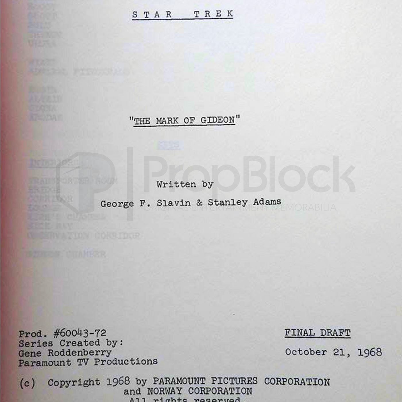 Original final draft script used in the production of the 1966 science fiction serrie Star Trek: The Original Series. The iconic series "Star Trek" follows the crew of the starship USS Enterprise as it completes its missions in space in the 23rd century. Captain James T. Kirk -- along with half- human/half-Vulcan science officer Spock, ship Dr. "Bones" McCoy, Ensign Pavel Chekov, communications officer Lt. Nyota Uhura, helmsman Lt. Hikaru Sulu and chief engineer Lt. Cmdr. Montgomery "Scotty" Scott -- confront strange alien races, friendly and hostile alike, as they explore unknown worlds. A 58 page, red cover final draft script dated October 21, 1968 for the memorable 3rd season TOS episode "The Mark of Gideon" which guest starred Sharon Acker as Odona and David Hurst as Hodin. This copy is stamped with number 48 in the upper right corner of its front cover, as is customary for production used TOS scripts, and this original distribution number has been crossed out and rewritten by hand as number 66. A sticker denoting the script as a "File Copy/Do Not Remove" has also been affixed to the upper right corner of the cover. The internal pages are free from any handwriting/markings.