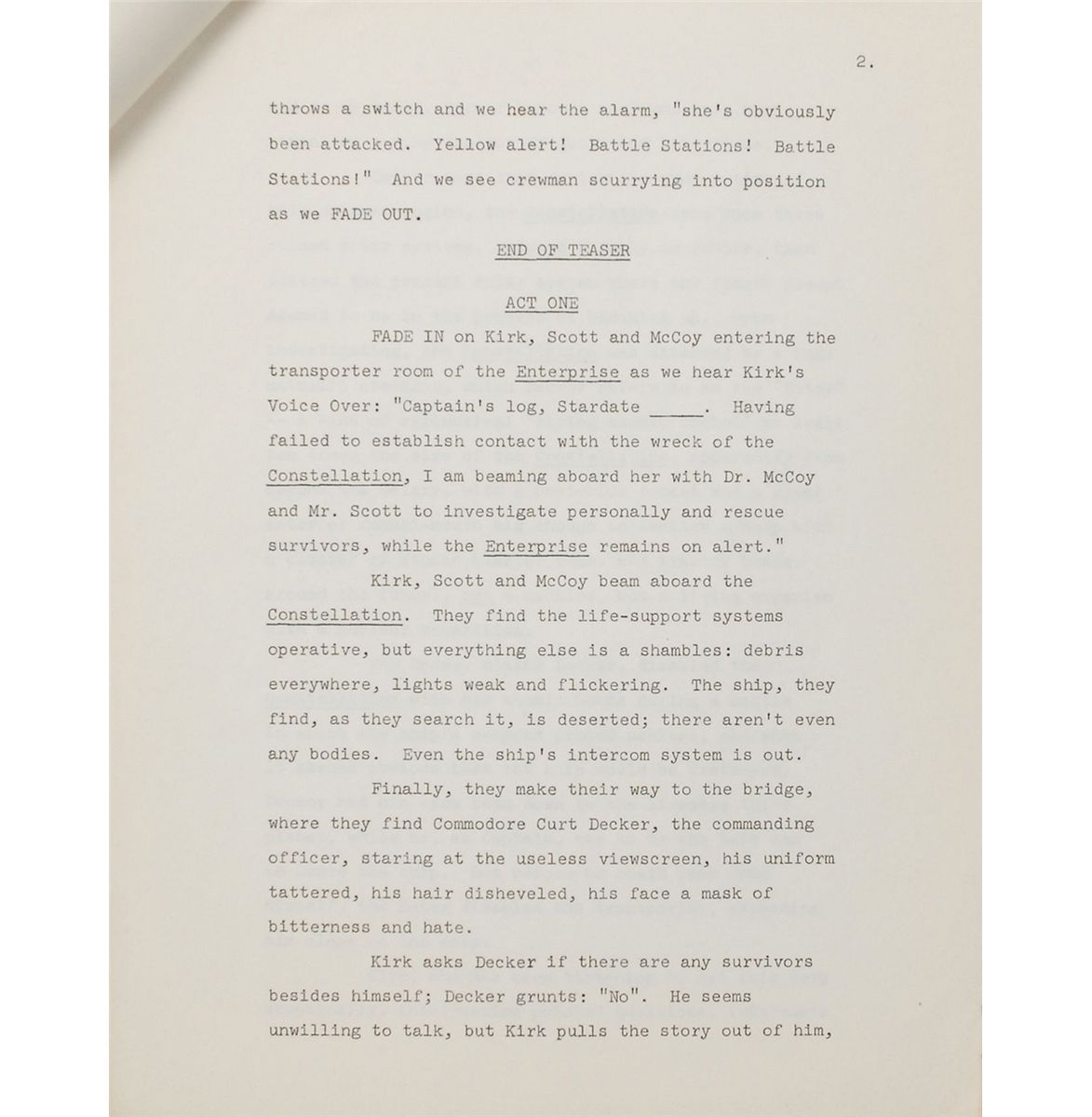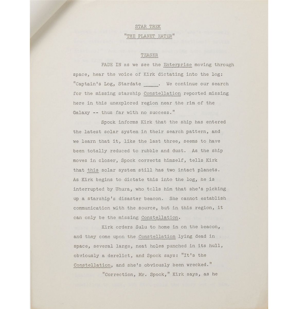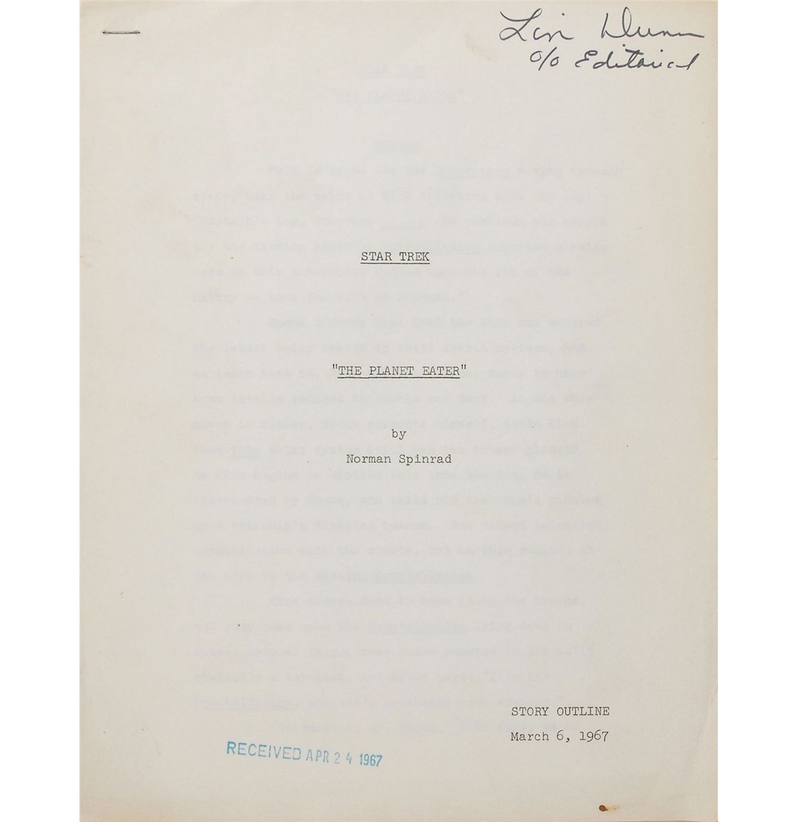 Scarce original story outline for the Star Trek Season Two episode entitled “The Planet Eater,” which would later be renamed The Doomsday Machine, belonging to Linwood Dunn, 8.5 x 11, 14 pages, written by Norman Spinrad, and headed at the bottom of the cover page, “Story Outline, March 6, 1967.” Dunn’s name is written at the top of the cover page, “Lin Dunn c/o Editorial,” with a blue received stamp at the bottom dated April 24, 1967. In fine condition, with a bit of light toning and creasing to cover page. Despite Spinrad’s wishes for the actual doomsday machine to be loaded with many different intimidating looking weapons, due to budgetary reasons, the actual model was a windsock dipped in cement. This same year, Dunn would be nominated for an Emmy award for achievements in cinematography for the show. A very early draft of one of the program’s most intense and well-received episodes.