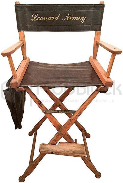 A very rare directors chair used by actor/director Leonard Nimoy during the production of Star Trek: The Search for Spock. This chair was used by the director while filming the movie and can be seen in various production stills and behind the scenes video. The chair remains in beautifully preserved condition with dark brown leather chair back and bottom. The chair back features the directors name "Leonard Nimoy" in gold, and also comes with attached side bags. Item remains in excellent, production used condition. This piece comes from the collection of the Star Trek prop master Joe Longo and remains in good production used condition.