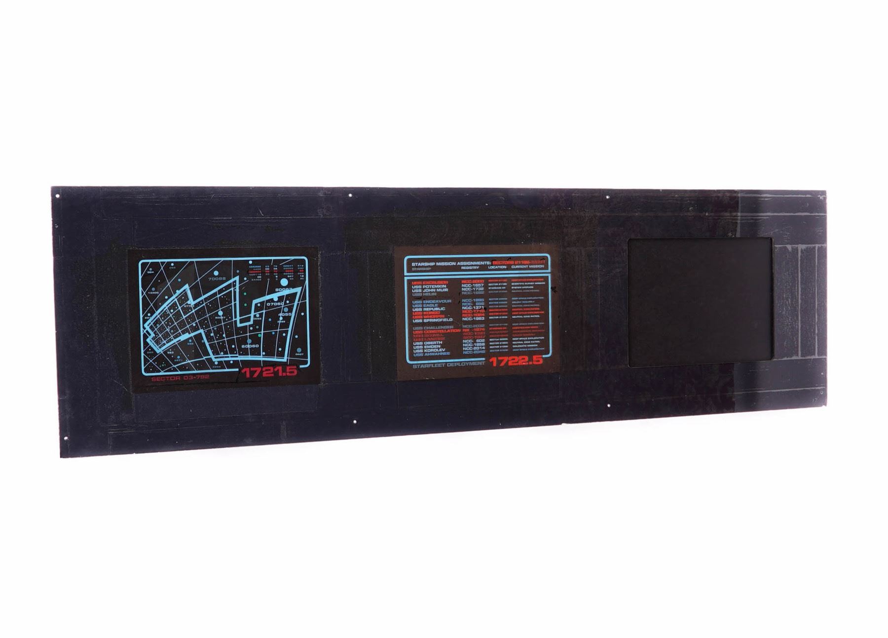 Large LCARS panel featured in the production of Star Trek: The Undiscovered Country. This large bridge style panel is made of black acrylic and features three rectangular holes where acrylic transparency's are present in two, the third being blacked out with a piece of black board. The two LCARS that are present are labeled "1721.5 and 1722.5" with one showing a star chart and the other written information. This item screen matches for later scenes in the film where the Enterprise is under attack by Chang, and can be seen over the right shoulder of Kirk on the bridge. This piece was originally sold in the Christes Star Trek auctions and remains in excellent, production used condition.