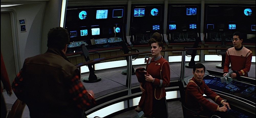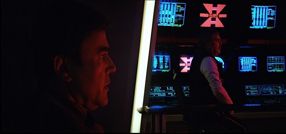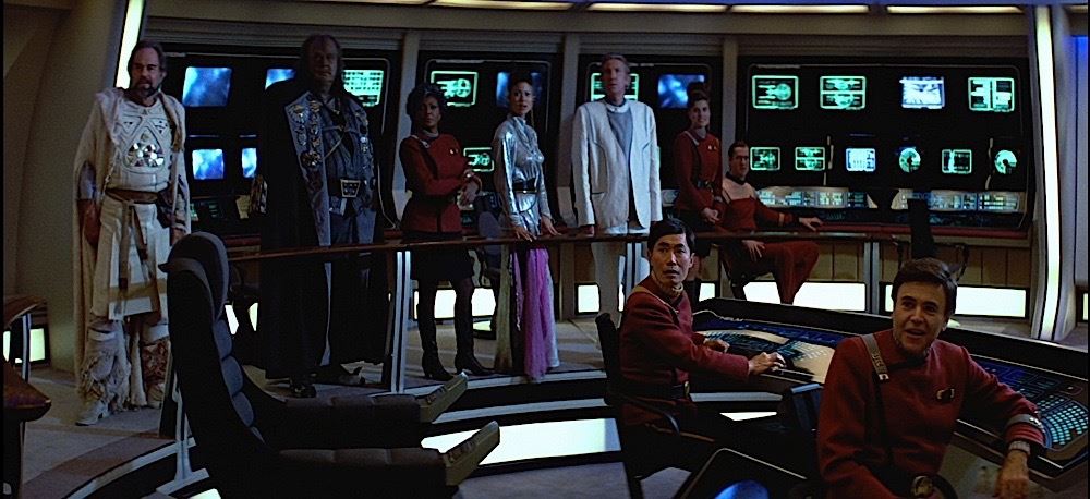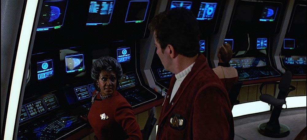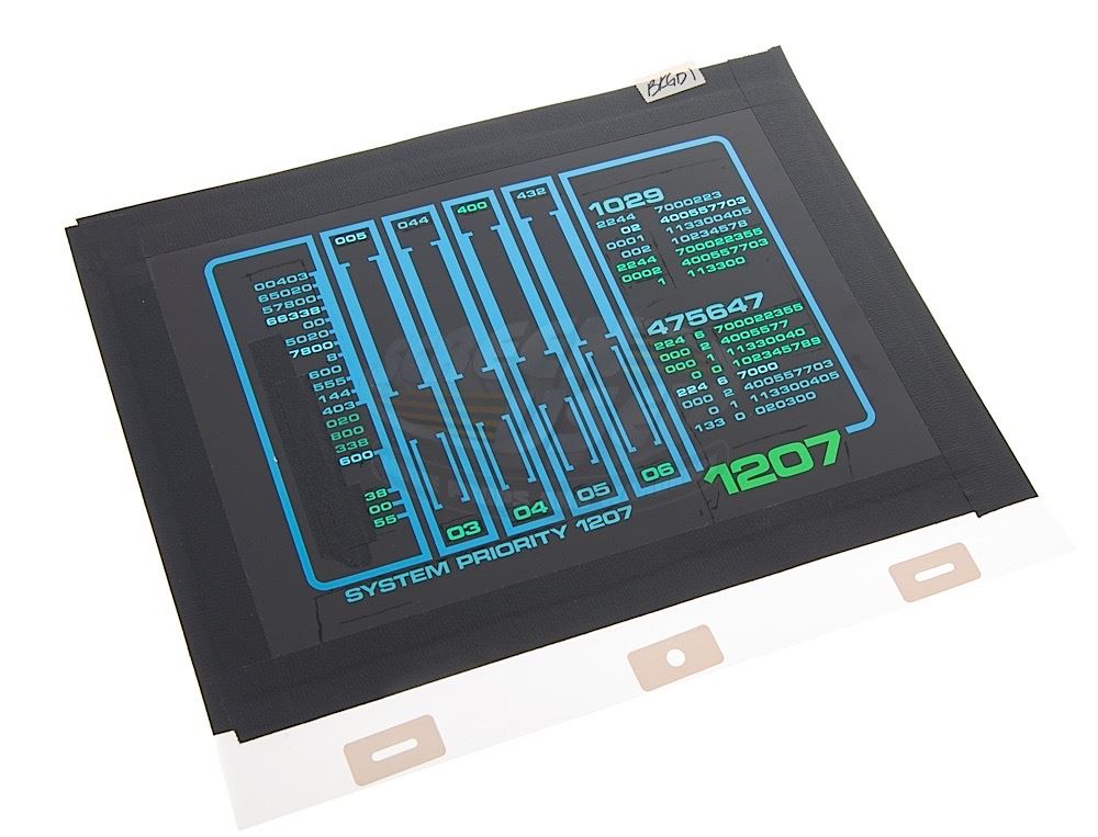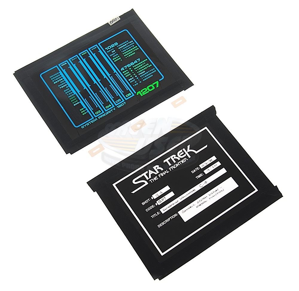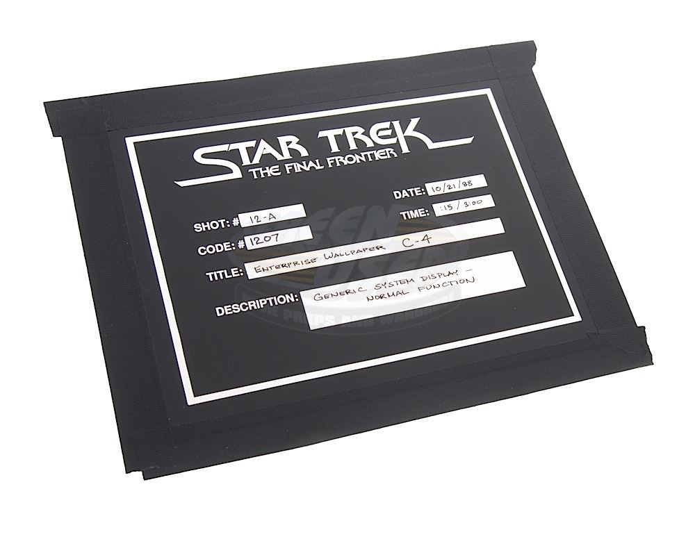 (Paramount Pictures, 1989) This bridge panel was custom-made by the production for use as set dressing during filming. Made of thin film with colored gels applied by hand. These cels were used to make animated displays to simulate computer graphic displays on the Enterprise bridge. Includes a "slate" cel with production info. The full item measures approximately 12" x 10", with the actual display area measuring approximately 8.5" x 6".