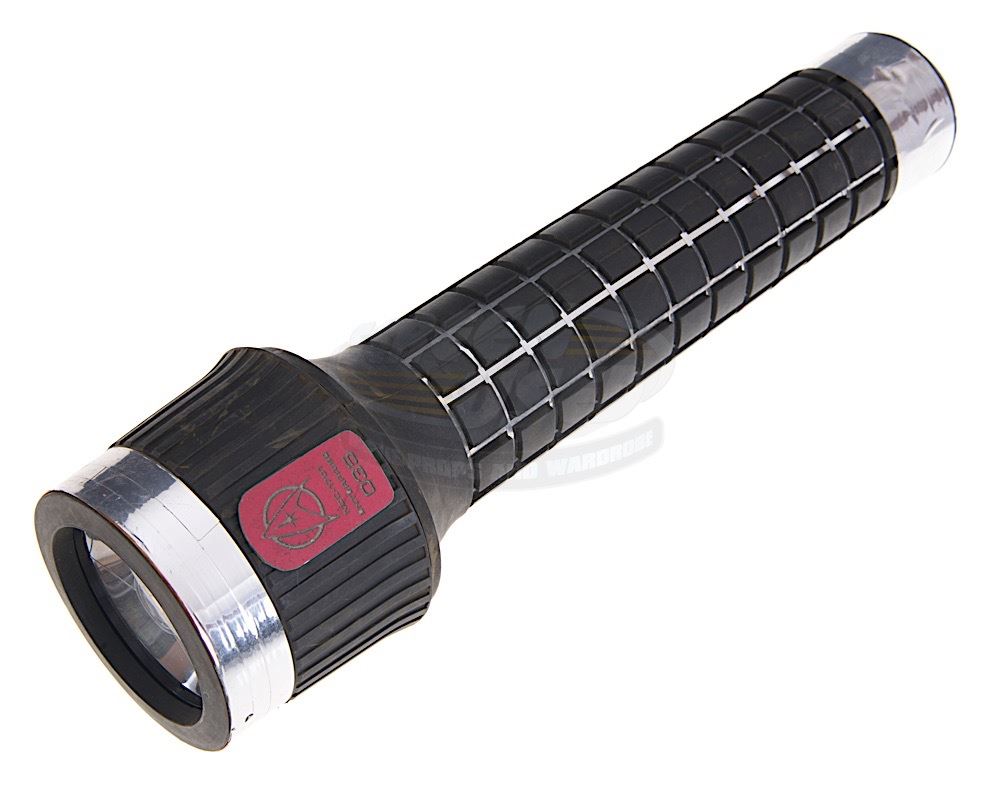 (Paramount Pictures, 1989) This flashlight was acquired by the production for use by James Doohan as "Scotty". The flashlight has been customized with a "NCC-1701 Enterprise" inventory tag attached to one side and chrome tape applied to the top and handle. Measures 11" in length. Minor wear from use is present.