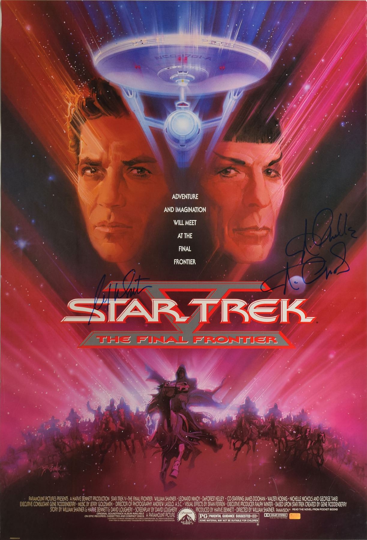 Color 27 x 39.75 one sheet movie poster for the 1989 film Star Trek V: The Final Frontier, showing brilliant Bob Peak artwork with the tagline: "Adventure and imagination will meet at the final frontier." The poster is signed in blue felt tip by William Shatner and Nichelle Nichols. Rolled and in fine condition.