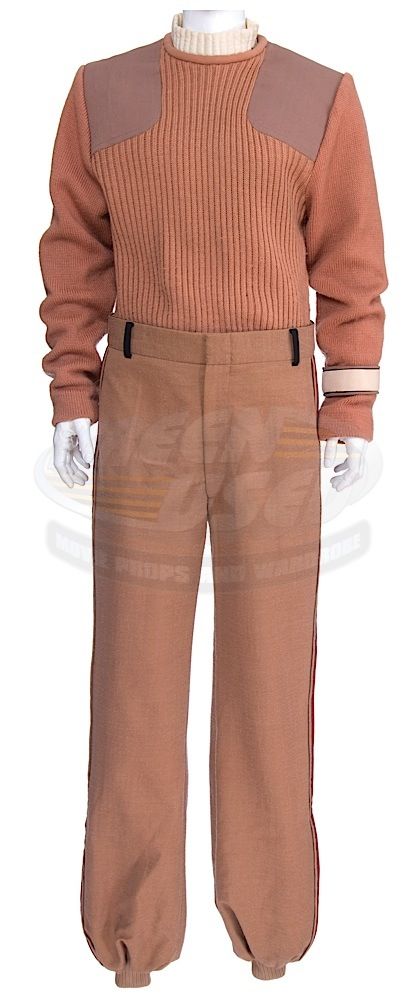 (Paramount Pictures, 1989) This Starfleet commando/field duty uniform was custom-made by the production for use by Leonard Nimoy as "Spock". The costume consists of caramel colored wool pants with an elastic attachment at the spine and a red stripe down the outside seam, a matching sweater with a zip up the back and corresponding snaps, clasps and brown shoulder accents and a command white sleeveless undershirt with a ribbed collar and a zip up the back. All three components feature sewn on Paramount tags reading 'Nimoy'. Along with our ScreenUsed COA, this item comes with a Filmwelt Collection COA.