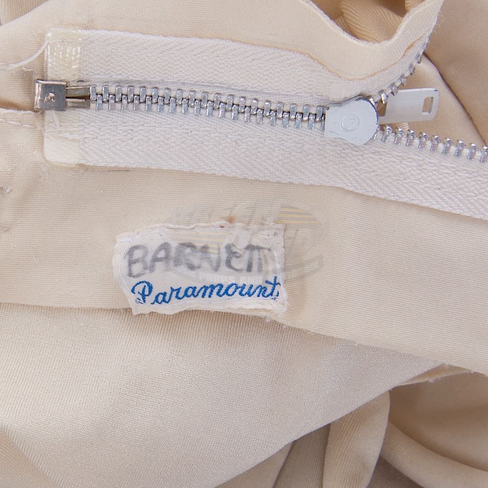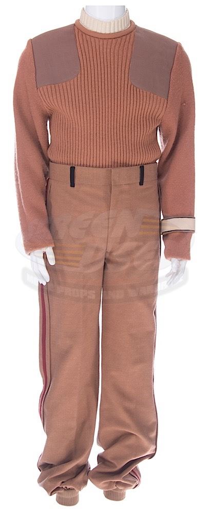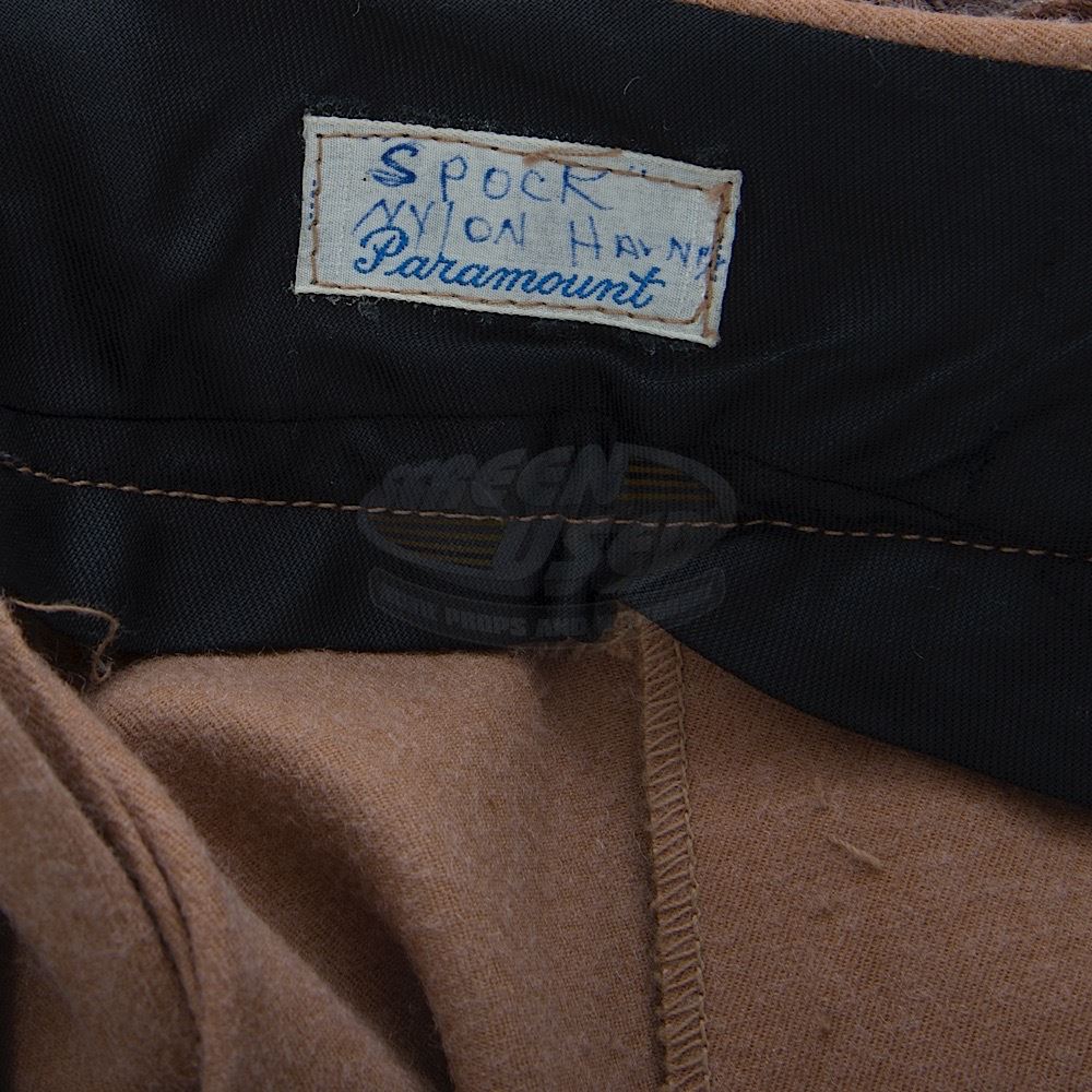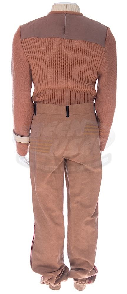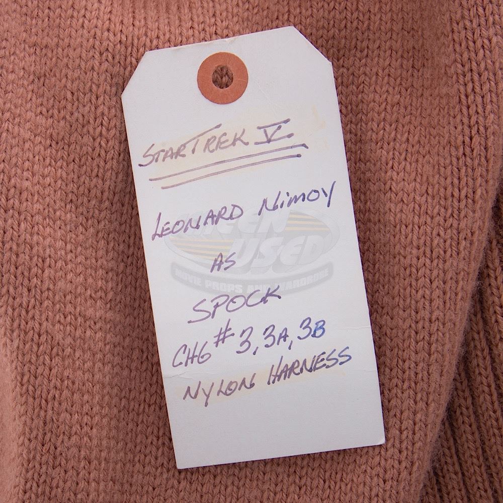 (Paramount Pictures, 1989) This Starfleet commando/field duty uniform was custom-made by the production for use by Leonard Nimoy as "Spock". The costume consists of caramel colored wool pants with a red stripe down the outside seam and have a small opening on each side to accomodate the wire harness for filming, a matching sweater with a zip up the back and corresponding snaps, clasps and brown shoulder accents and a command white sleeveless undershirt with a ribbed collar and a zip up the back. The sweater features a sewn on Paramount tag that reads 'Nimoy', the pants have a tag that reads "Spock, Nylon Harness" and the undershirt has a tag that reads "Barnett". Included with the costume is a production used costume tag that details the change used and Nylon Harness.