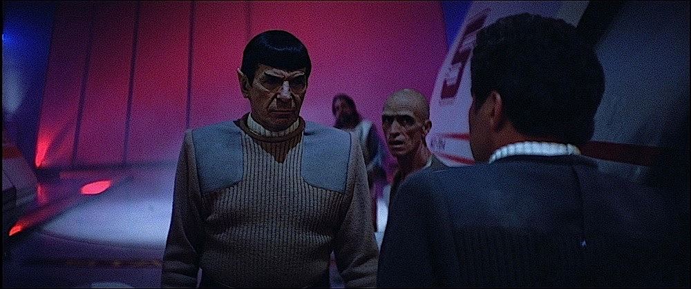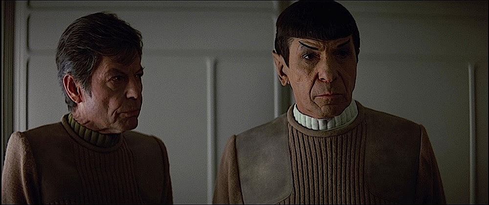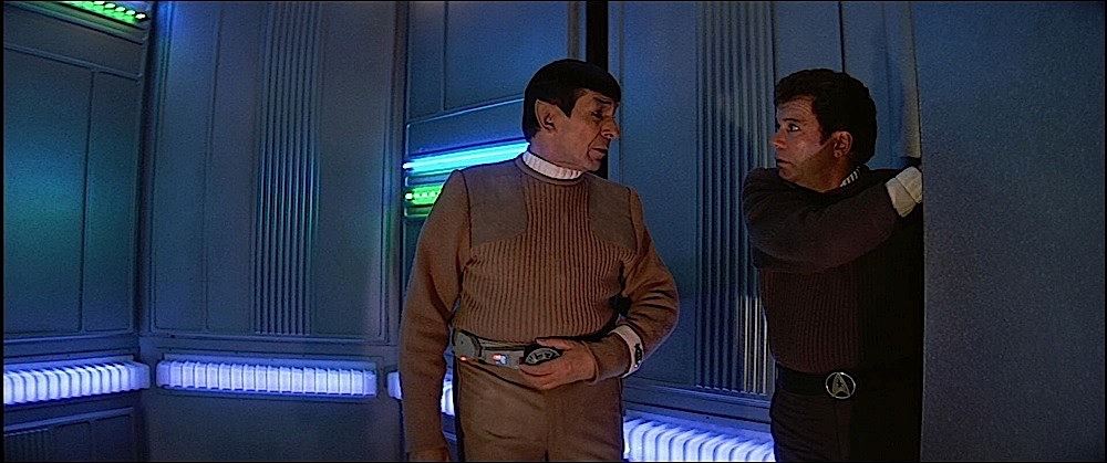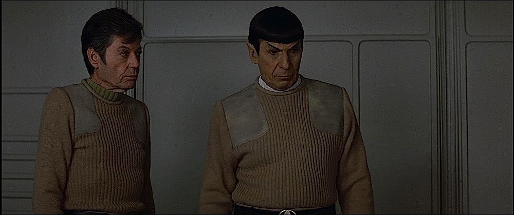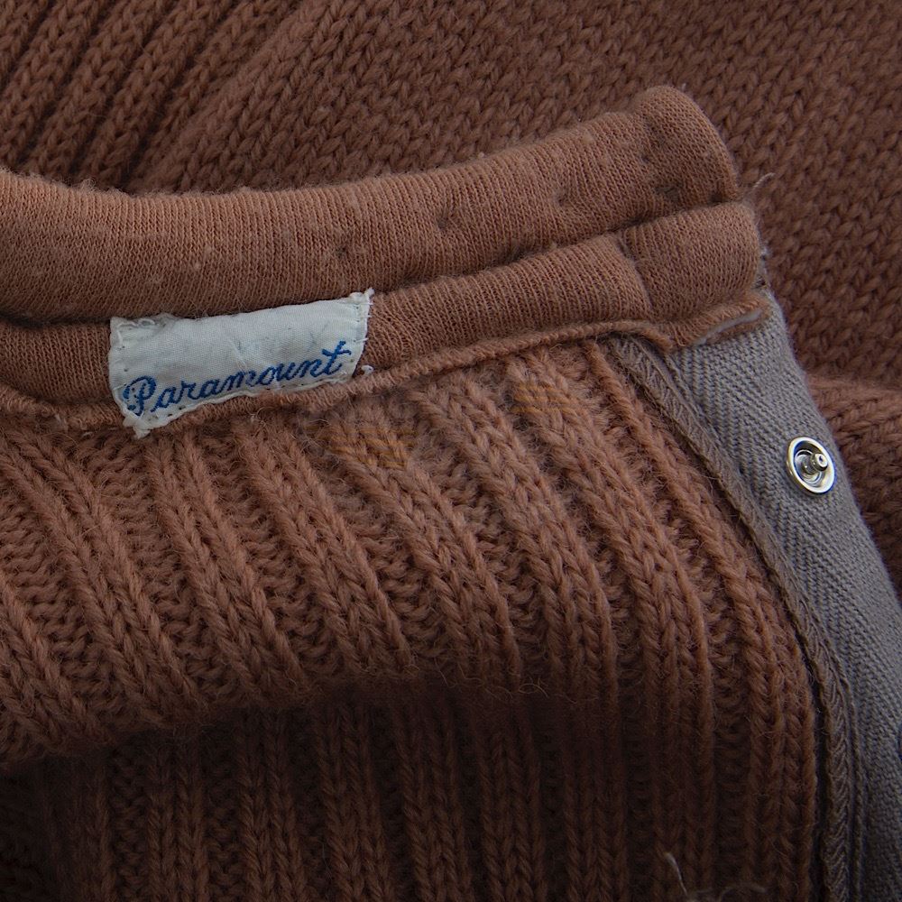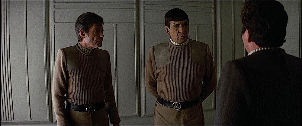 (Paramount Pictures, 1989) This Starfleet commando/field duty uniform was custom-made by the production for use by Leonard Nimoy as "Spock". The costume consists of caramel colored wool pants with a red stripe down the outside seam and have a small opening on each side to accomodate the wire harness for filming, a matching sweater with a zip up the back and corresponding snaps, clasps and brown shoulder accents and a command white sleeveless undershirt with a ribbed collar and a zip up the back. The sweater features a sewn on Paramount tag that reads 'Nimoy', the pants have a tag that reads "Spock, Nylon Harness" and the undershirt has a tag that reads "Barnett". Included with the costume is a production used costume tag that details the change used and Nylon Harness.