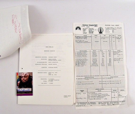 From 1991's "Star Trek VI: The Undiscovered Country", the last in the "original cast" features, comes this complete originial 53 Day Shooting Schedule plus the 2nd Unit schedule plus actual original on-set call sheets along with the inter-office memo from co-producer Marty Hornstein. These were issued to actor Paul Rossilli who played Brig. General Kerla. Also included is a rare Limited Edition "Star Trek VI" trading card (#A87) with a photo of Paul Rossilli as Brig General Kerla, and personally signed by him.