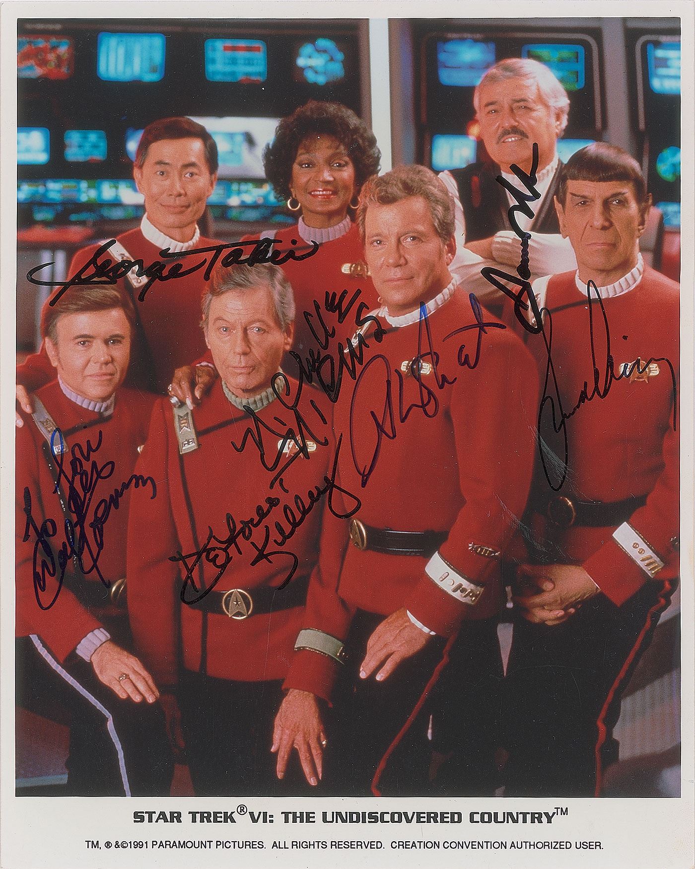 Color glossy 8 x 10 Paramount Pictures publicity photo of the cast of the 1991 film Star Trek VI: The Undiscovered Country, signed in blue or black felt tip by William Shatner, Leonard Nimoy, George Takei, James Doohan, Nichelle Nichols, DeForest Kelley, and Walter Koenig, who adds the inscription, "To Lou." In fine condition.