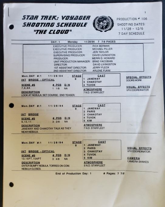 "Star Trek Voyager" 1994 Shooting Schedule The Cloud 11/26 - 12/6 7 day schedule Season 1 Episod