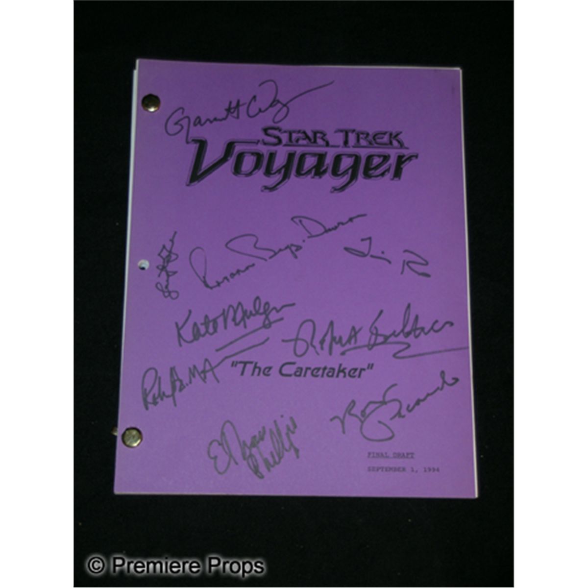 This is the rarest of the Star Trek Voyager scripts… from the Pilot episode “The Caretaker” that launched the series. Autographed on the cover by series stars Kate Mulgrew (Janeway), Garret Wang (Harry Kim), Jennifer Lein (Kess), Roxanne Dawson (Torres), Tim Russ (Tuvok), Robert Beltran (Chakotay), Robert Duncan McNeil (Paris), Ethan Phillis (Neelix) and Robert Picardo (The Doctor). The script was very obviously signed very early into the production given that the signatures are all much more detailed and full then some of the actors give now at conventions. This script was a given direct from a producer on the series!
