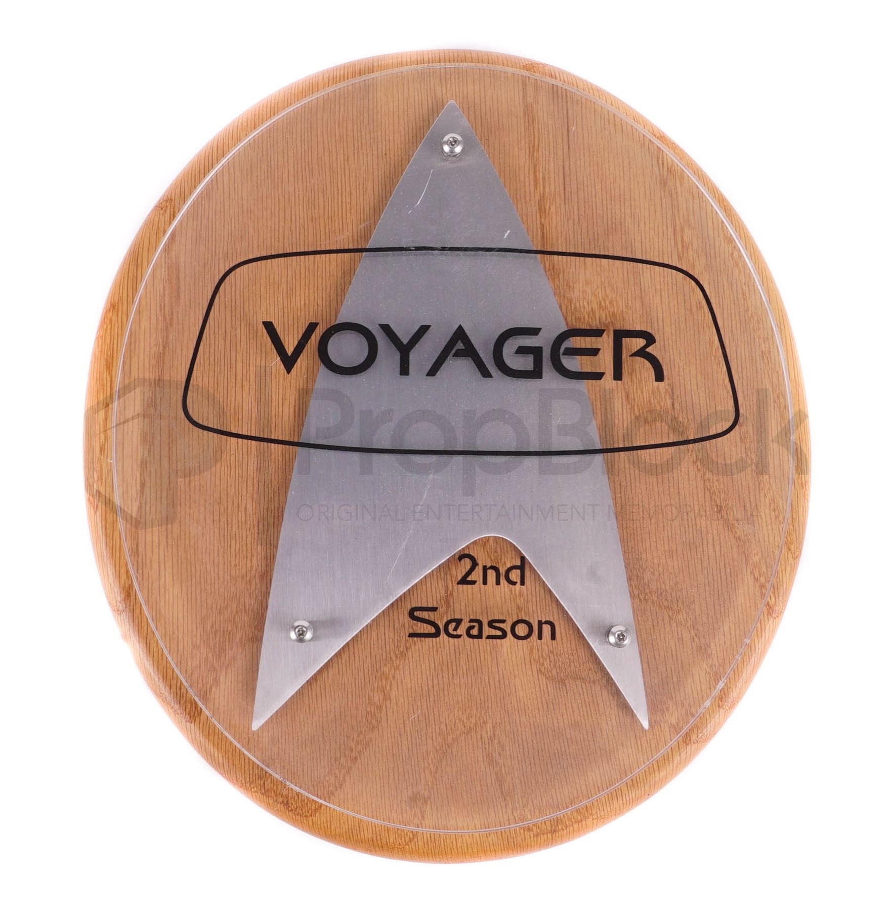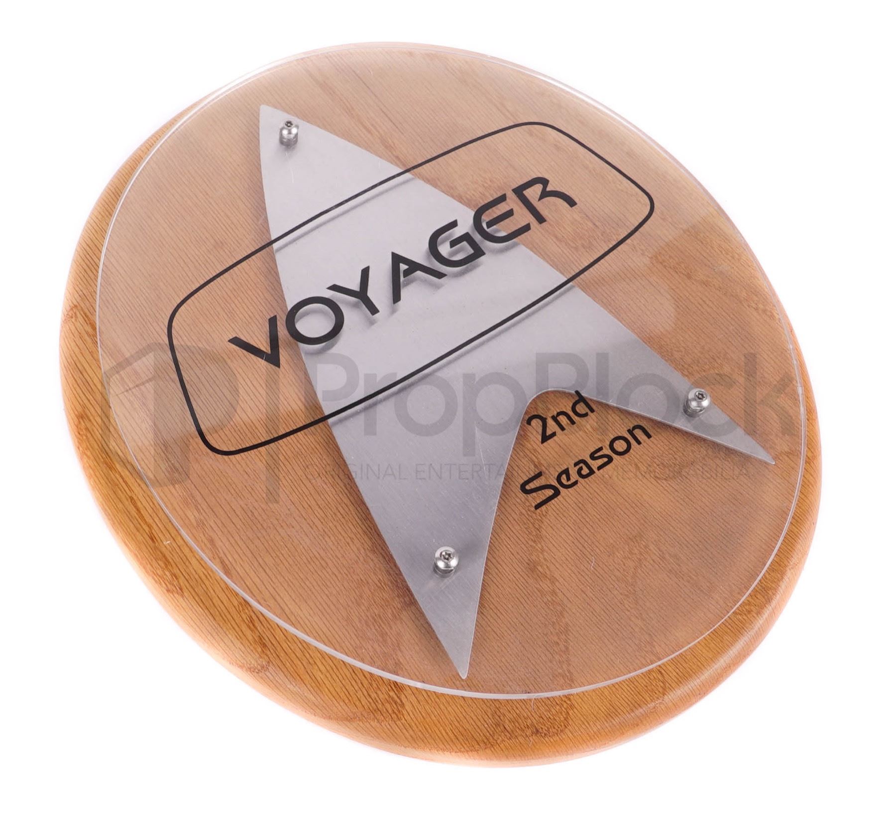 Plaque gift given out to crew members during the fourth season of Star Trek: Voyager. These types of gifts were made by the production for selected cast and crew members. Made of a piece of light brown wood in an oval shape, this piece features a clear piece of acrylic featuring the Starfleet logo and the lettering "Voyager 2nd Season". This piece comes from the collection of the Star Trek prop master Joe Longo and remains in good production used condition.