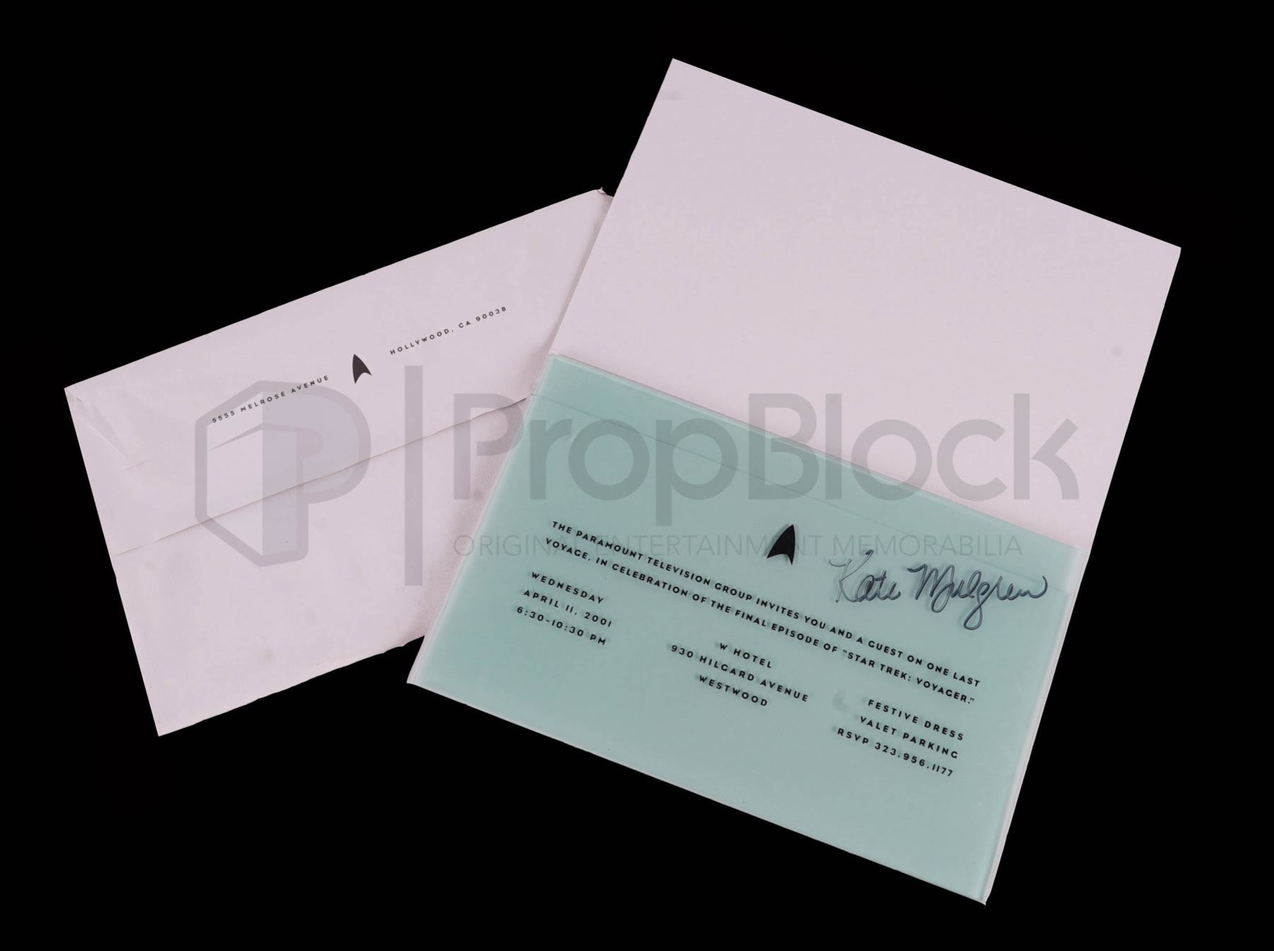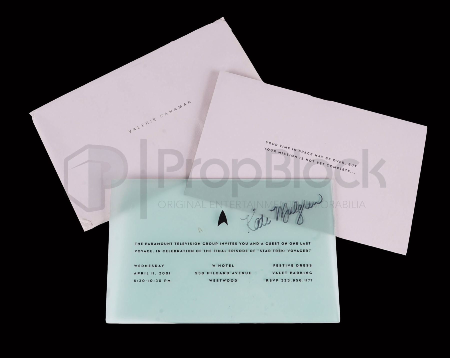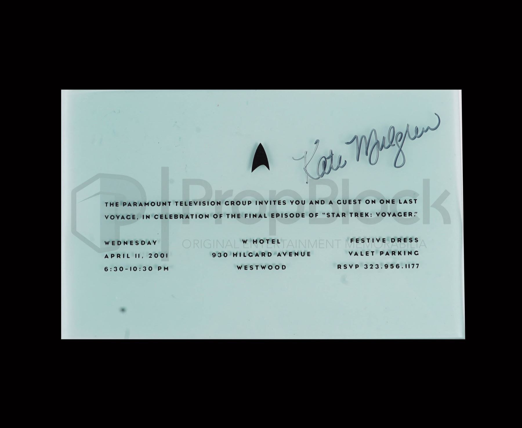 Invitation given out to members of the cast and crew for the wrap party of the series finale of Star Trek: Voyager. This piece is made of frosted glass with black lettering and has been signed by Kate Mulgrew who portrayed Captain Janeway. This piece is accompanied by its original white card case and envelope which is addressed to "Valerie Canamar" who was the assistant to Michael Westmore during the filming of Star Trek: Voyager.