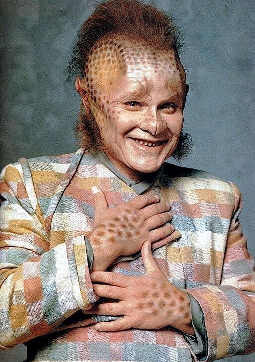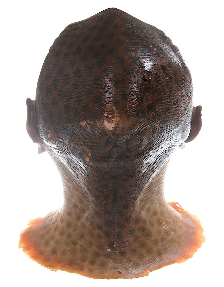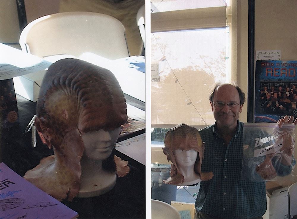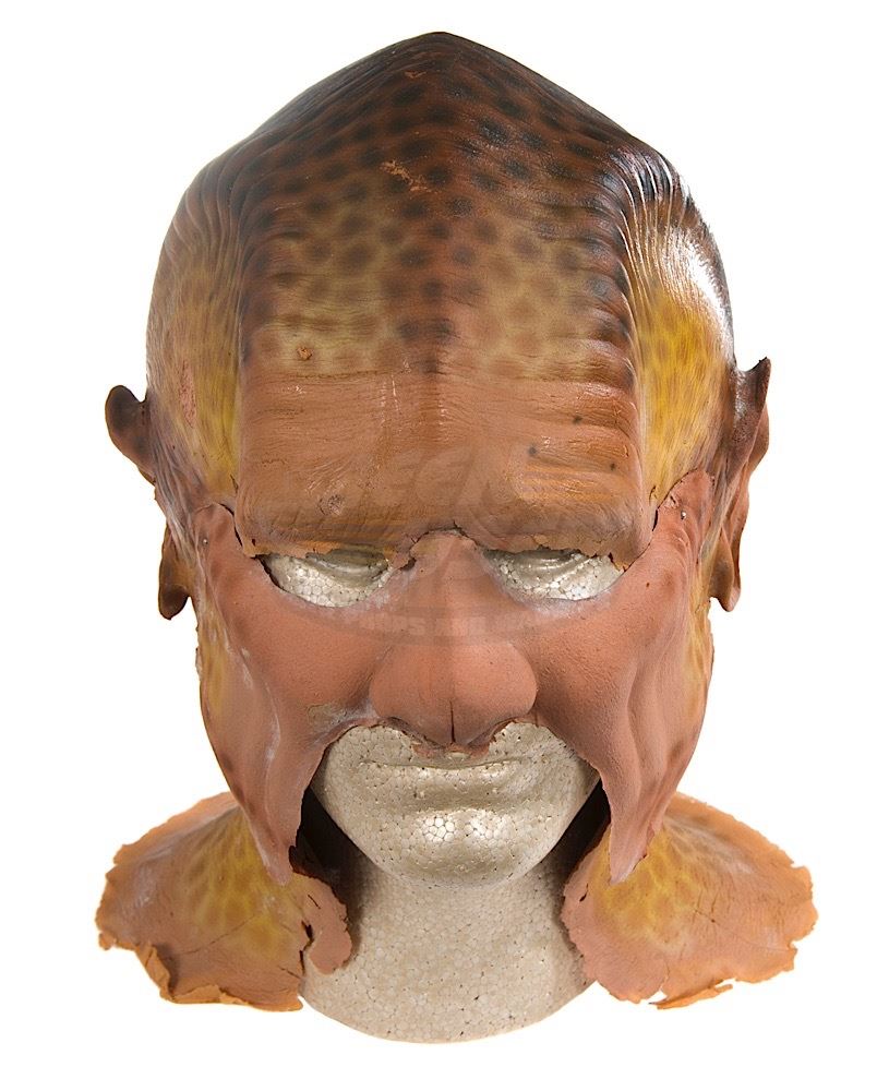 (Paramount-TV, 1995-01) This set of head and face appliances were custom-made by the production for use by Ethan Phillips as "Neelix". The appliances consist of a full one piece head section and a nose and cheeks section. Both sections feature custom airbrush detailing. This set of appliances were kept by Mr. Phillips after filming and personally sold to the consignor. A photo of Mr. Phillips with this exact set of appliances is included. The appliances have some wear from use and storage, but remain in good condition and are displayed on a Styrofoam head.