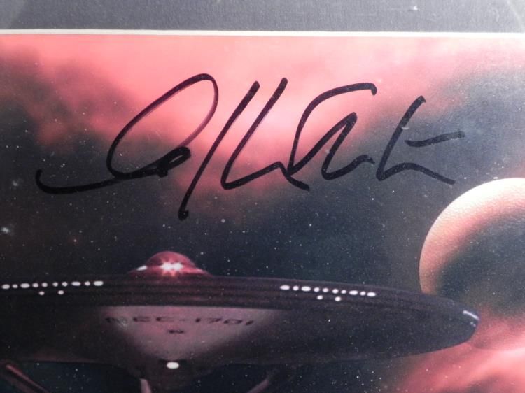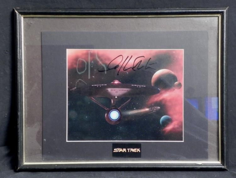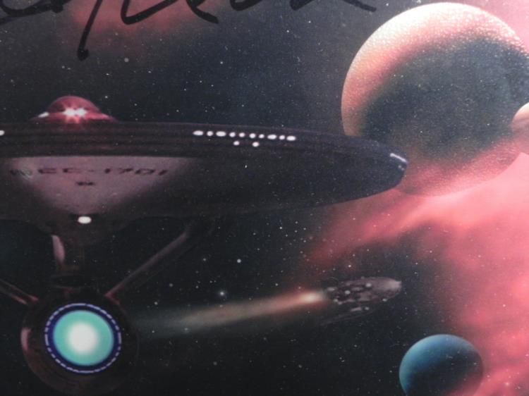 Here is the U.S. Enterprise moving through reddish space clouds with two planets in the background, and Captain Kirk's signature overhead. Autograph: William Shatner in black Sharpie at the top Medium: Photo print on textured paper Image size: 7 1/2 x 9 1/2 inches Framing: In black matte floated on a charcoal black background in black painted wood frame Overall size: 13 x 17 inches Condition: Excellent; a few nicks to the frame