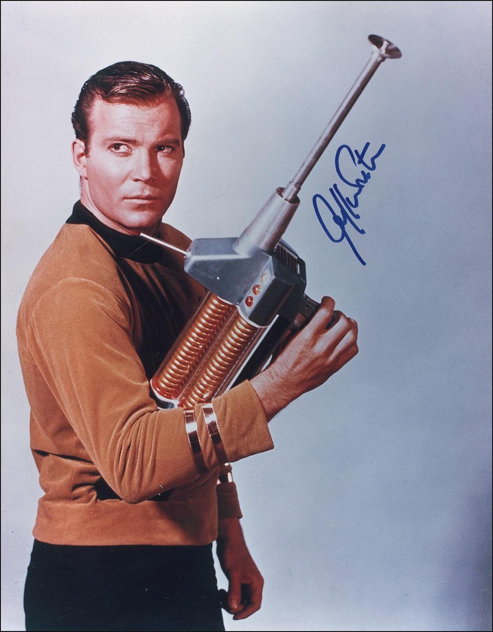 Color satin-finish 11 x 14 photo of Captain Kirk holding an intimidating laser weapon, signed in blue felt tip. Originally obtained by in-person specialist Mike Wehrmann. A couple of trivial corner tip dings, otherwise very fine condition. Pre-certified PSA/DNA and RRAuction COA.