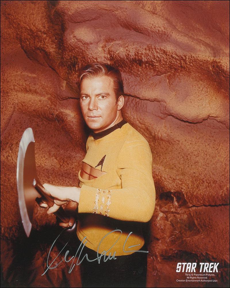 Color glossy 8 x 10 photo of Captain Kirk, his shirt torn open and brandishing a lirpa, signed in silver ink, “William Shatner.” In fine condition, with a few faint surface marks.