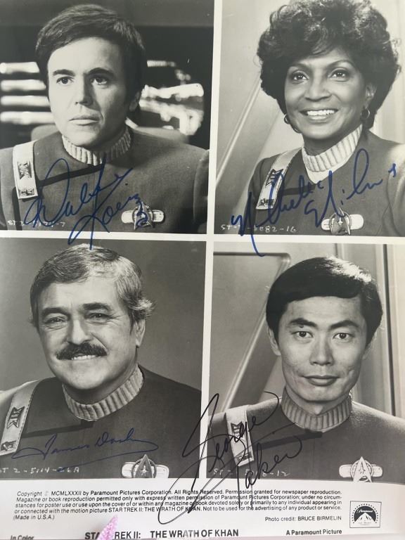 Star Trek Wrath Of Khan cast signed photo autographed by Walter Koenig, Nichelle Nichols, James Doohan and George Takei. 8x10 inches. HL20145