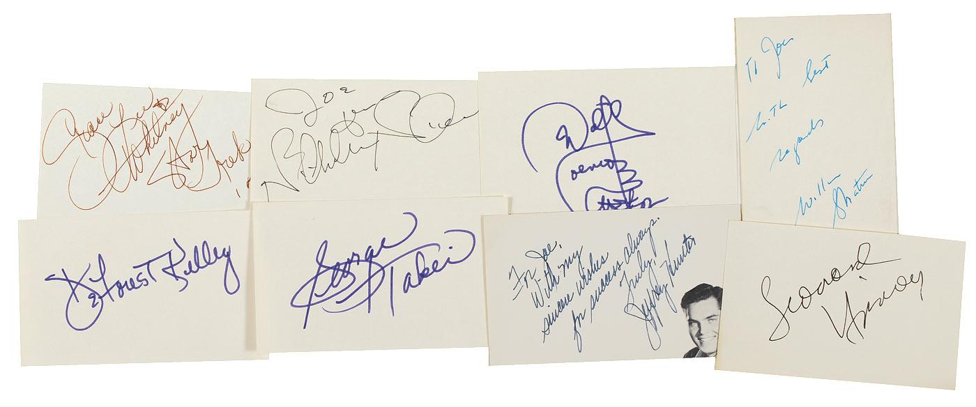 In-person ink and felt tip signatures of Jeffrey Hunter (ins), William Shatner (ins), Leonard Nimoy, George Takei, Walter Koenig, DeForest Kelly, Nichelle Nichols, and Grace Lee Whitney on individual off-white 5 x 3 cards. A small clipped photo of Hunter is affixed to the lower corner of his card. In fine condition. An instant collection of the original science fiction classic.