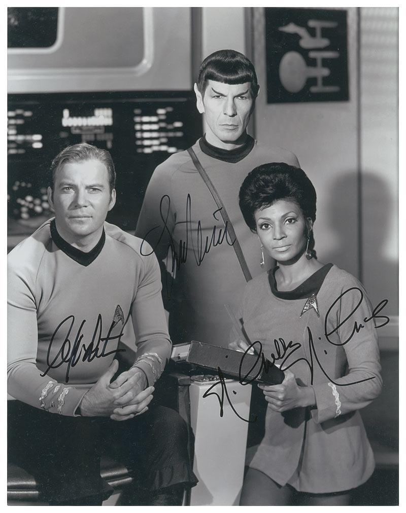 Glossy 11 x 14 photo of Kirk, Spock, and Uhura on the bridge of the Enterprise, signed in black felt tip by William Shatner, Leonard Nimoy, and Nichelle Nichols. In fine condition, with some scattered light spotting to emulsion, and a few light surface marks.