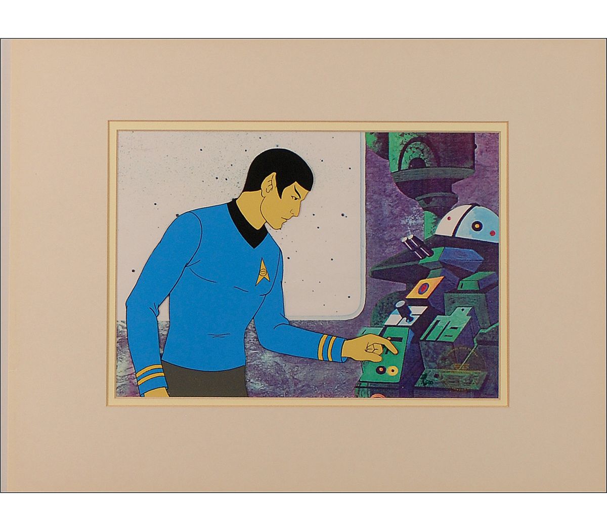 Hand-painted animation cel featuring Spock, 11.5 x 8, taped against a pre-printed color background. Double matted to an overall size of 18 x 14. In fine condition.