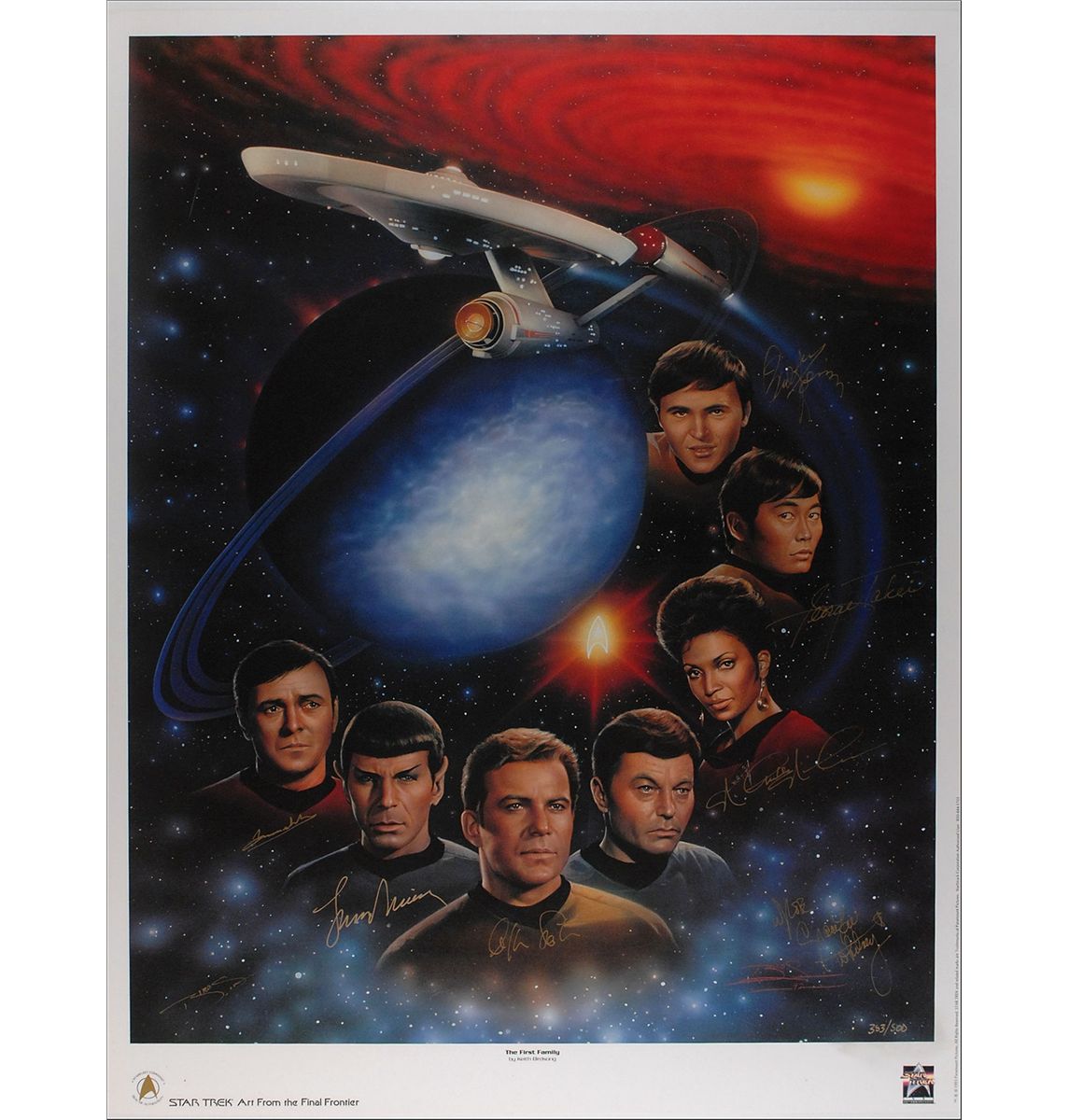Color limited edition 26 x 34 print entitled ‘The First Family,’ numbered 353/500, signed in gold ink by William Shatner, Leonard Nimoy, George Takei, Nichelle Nichols, Walter Koenig, James Doohan, and Grace Lee Whitney. Also signed in gold ink by the artist, Keith Birdsong. Rolled and in fine condition.
