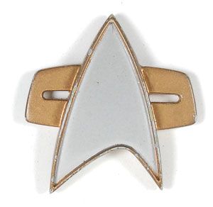 Screen-used Starfleet comm badge, used throughout the Star Trek television shows. Painted plastic badge measures approximately 2 x 2, with a Velcro patch affixed to the back, and is numbered “33” in black felt tip. In fine condition.