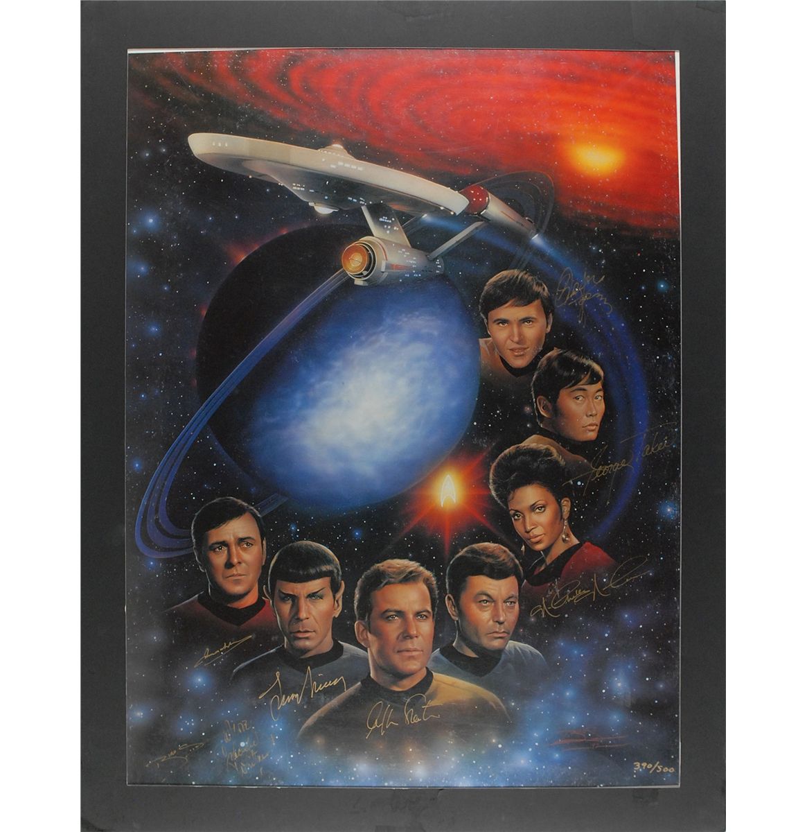 Color limited edition 23.5 x 31.5 print of the original Star Trek crew, numbered 390/500, signed in gold ink by William Shatner, Leonard Nimoy, George Takei, Nichelle Nichols, Walter Koenig, James Doohan, and Grace Lee Whitney. Also signed in gold ink by the artist. Matted behind plastic to an overall size of 28 x 36. In fine condition, with some surface loss to the mat.