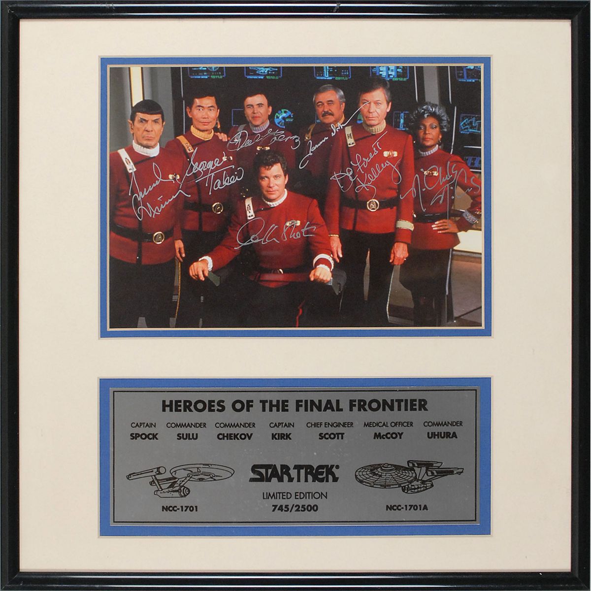 Limited edition color 10 x 7 photo of the command crew of the Enterprise, 745/2000, signed in silver ink by William Shatner, Leonard Nimoy, DeForest Kelley, George Takei, Nichelle Nichols, Walter Koenig, and James Doohan. Double-matted and framed with a descriptive plaque to an overall size of 16.25 x 16.25. In fine condition.