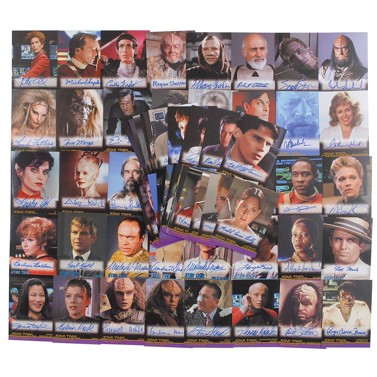 Collection of 64 Star Trek trading cards produced by CBS Studios, each signed in blue felt tip by the actor or actress pictured. Signers are: F. Murray Abraham, Kirstie Alley, Barbara Baldwin, Michael Berryman, Michele Ameen Billy, Roger Aaron Brown, Todd Bryant, Charles Cooper, James Cromwell, Robin Curtis, Rosana DeSoto, Andrea Dromm, Robert Easton, Ike Eisenman, Robert Ellenstein, Linda Fetters-Howard, Cully Fredricksen, David Gautreaux, Jenette Goldstein, Cynthia Gouw, Nicholas Guest, Carl Held, Darryl Henriques, Alex Henteloff, Catherine Hicks, Rif Hutton, Jacqueline Kim, Lloyd Kino, Thomas Kopache, Alice Krige, Stephen Liska, Laurence Luckinbill, Stephen Manley, Barbara March, Steve Marlo, Neal McDonough, Scott McGinnis, Ronald D. Moore, Tom Morga, Phil Morris, George Murdock, Stephanie Niznik, Jeremy Roberts, Tim Russ, Leon Russom, John Schuck, Juson Scott, W. Morgan Sheppard, Cathie Shirriff, Michael Snyder, Don Stark, Eric Steinberg, Scott Strozier, Dendrie Taylor, Kirk Thatcher, Malachi Throne (2), Billy Van Zandt, Gwynyth Walsh, David Warner, Michael Welch, Grace Lee Whitney, Spice Williams, and Alfre Woodard. In overall fine condition.