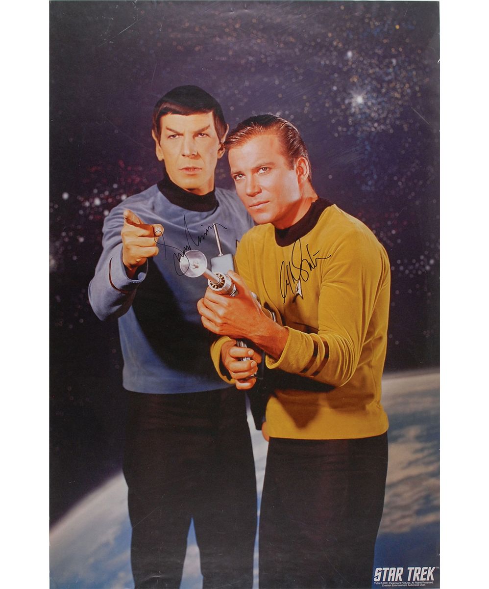 Color 24 x 36 print of Captain Kirk and Mr. Spock, signed in black felt tip by William Shatner and Leonard Nimoy. Rolled and in fine condition, with scattered edge dings and creases.