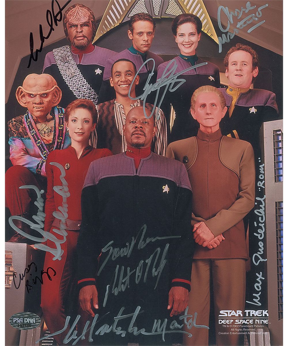 Two items: first, a color 26 x 36 composite poster of the Voyager crew, signed in black felt tip by four cast members (Robert Picardo, Ethan Phillips, Roxann Dawson, and Tim Russ), in gold ink by the artist, Dru Blair, and in silver ink by four of the show’s guest stars, including Marina Sirtis. Framed to an overall size of 28 x 41. Second, a color glossy 8 x 10 photo of the cast of Star Trek: Deep Space Nine, signed in black felt tip and silver ink by Michael Dorn, Armin Shimerman, Robert O'Reilly, J. G. Hertzler, Max Grodenchik, Cirroc Lofton, Casey Biggs, and Chase Masterson, accompanied by a full letter of authenticity from PSA/DNA. In fine condition. Oversized.